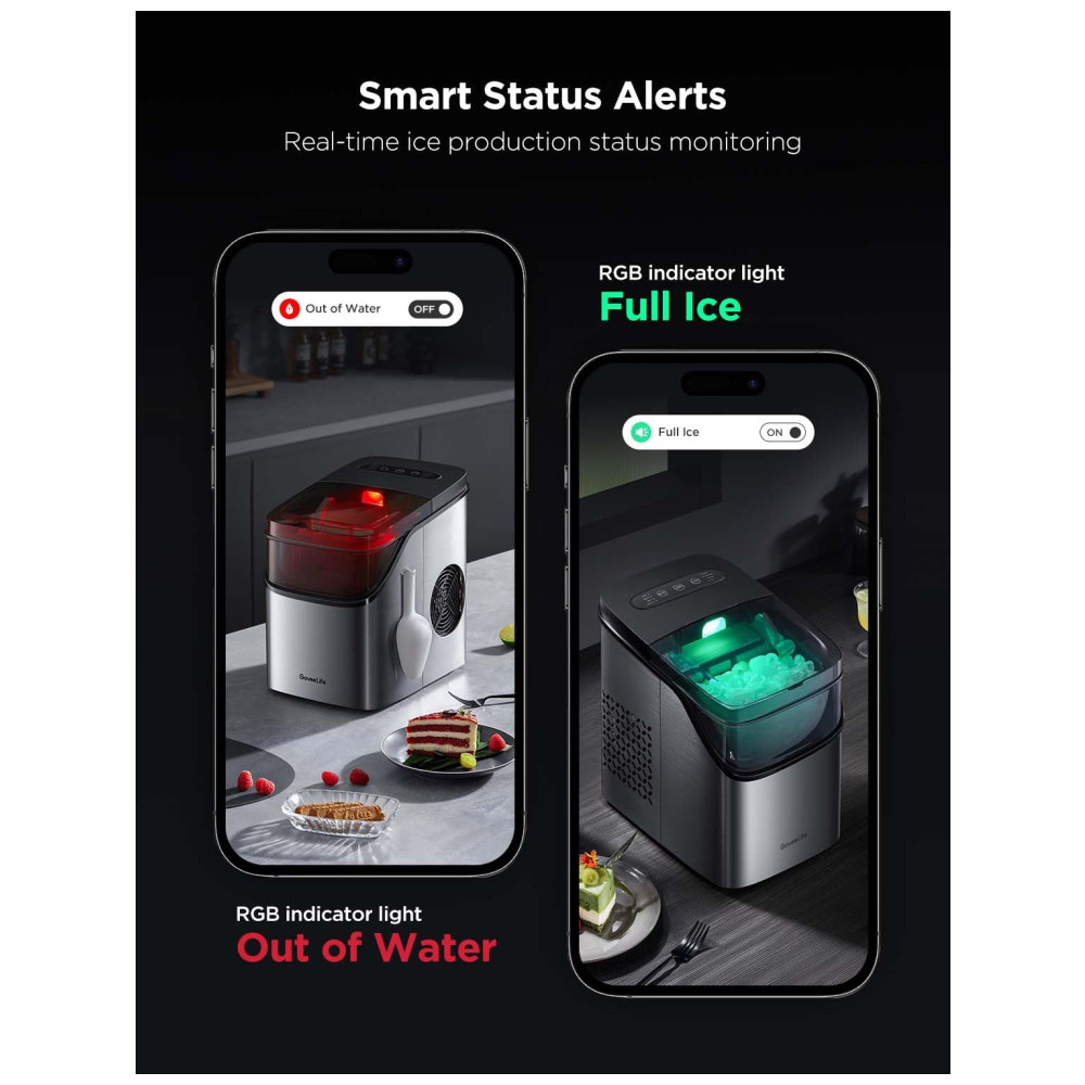 Wi-Fi Integrado e Controle por Voz: Conecte sua máquina de gelo ao aplicativo e controle-a por comandos de voz via Alexa e Google Assistant. Monitore o status do dispositivo e programe a produção de gelo fresco a qualquer hora e em qualquer lugar. (Compatível apenas com Wi-Fi de 2,4 GHz).