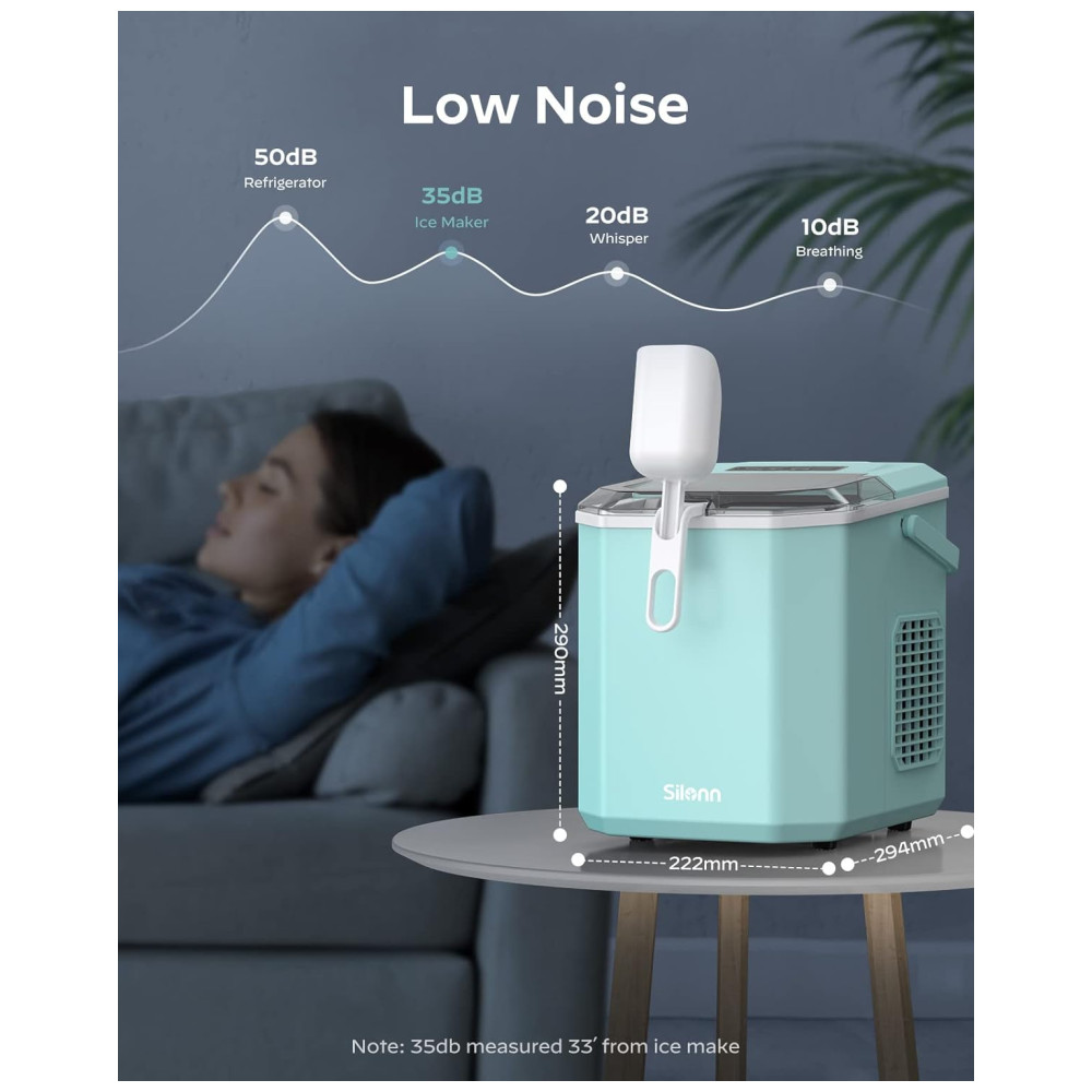 Tamanho compacto perfeito: Medindo apenas 22 x 29 x 29,5 cm, a máquina de gelo Silonn pode facilmente caber em um balcão, ilha de cozinha ou mesa sem ocupar muito espaço. Graças ao design de baixo ruído de 35 dB, você pode operar a máquina sem distrações barulhentas.