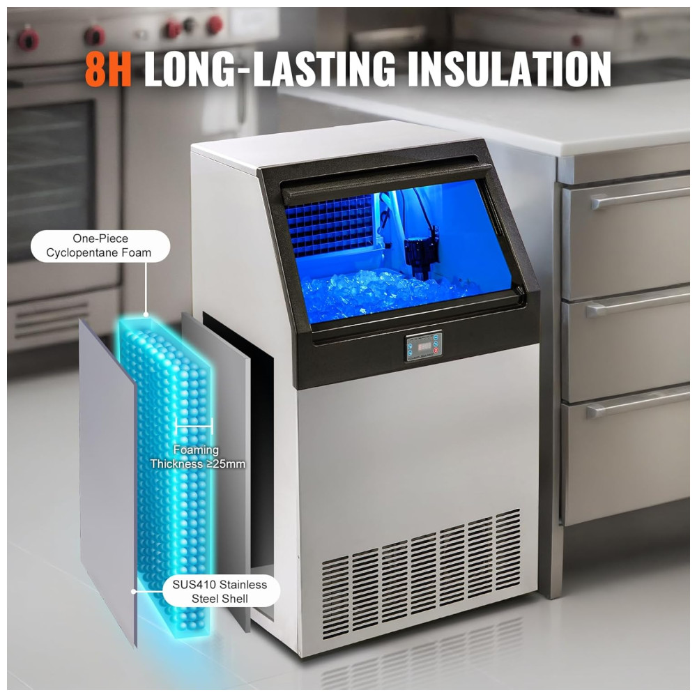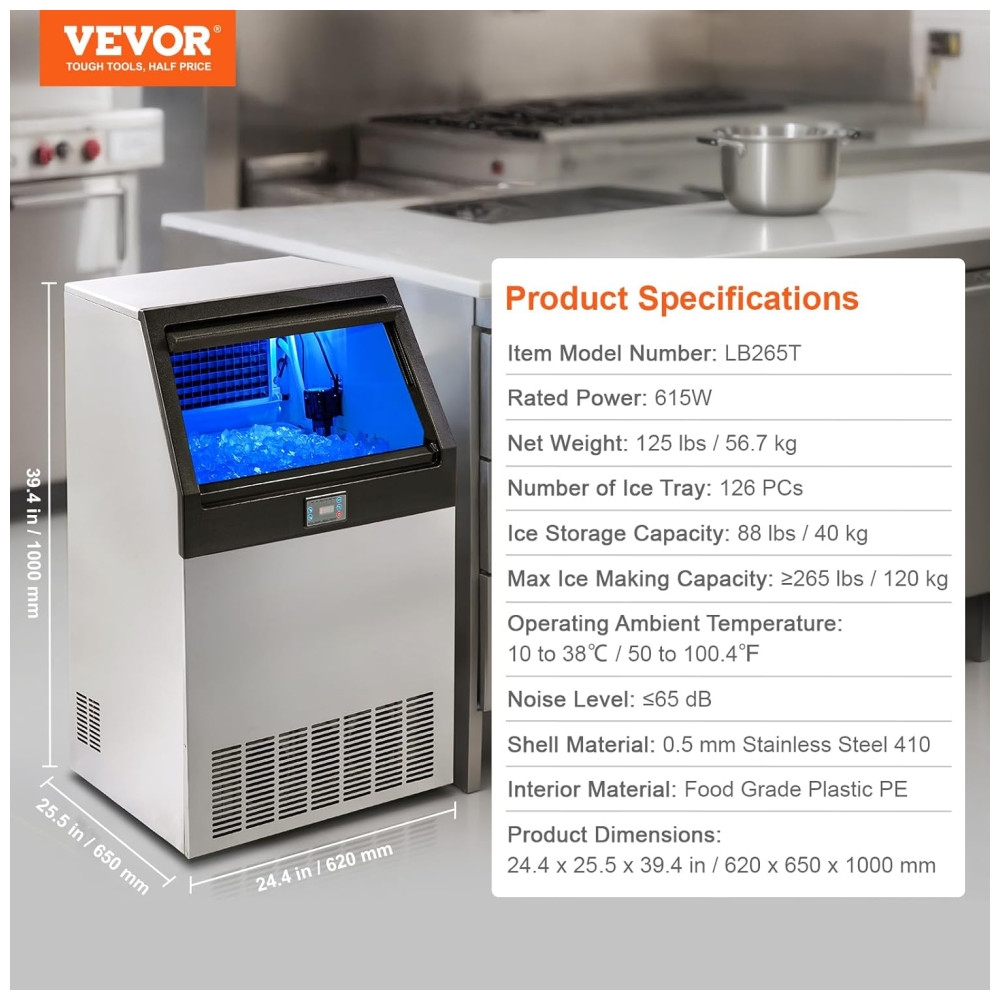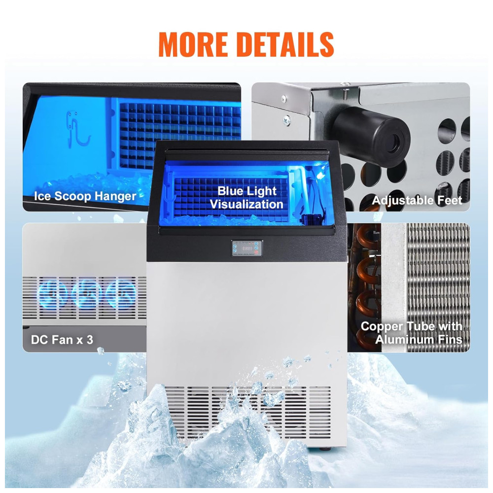 Máquina de Gelo Eficiente e Máquina de Gelo Eficiente. Grande capacidade: Alimentada pelo poderoso compressor, a máquina de gelo da VEVOR pode produzir cerca de 120 kg a cada 24 horas, cada ciclo de fabricação de gelo leva de 11 a 15 minutos depende da espessura do gelo que você precisa e gera Cubos de gelo de 126 unidades por ciclo. Enquanto isso, esta máquina de fazer gelo pode guardar 24 kg de gelo para guardar mais cubos de gelo, quebre as camadas de gelo e coloque as na caixa o máximo possível.