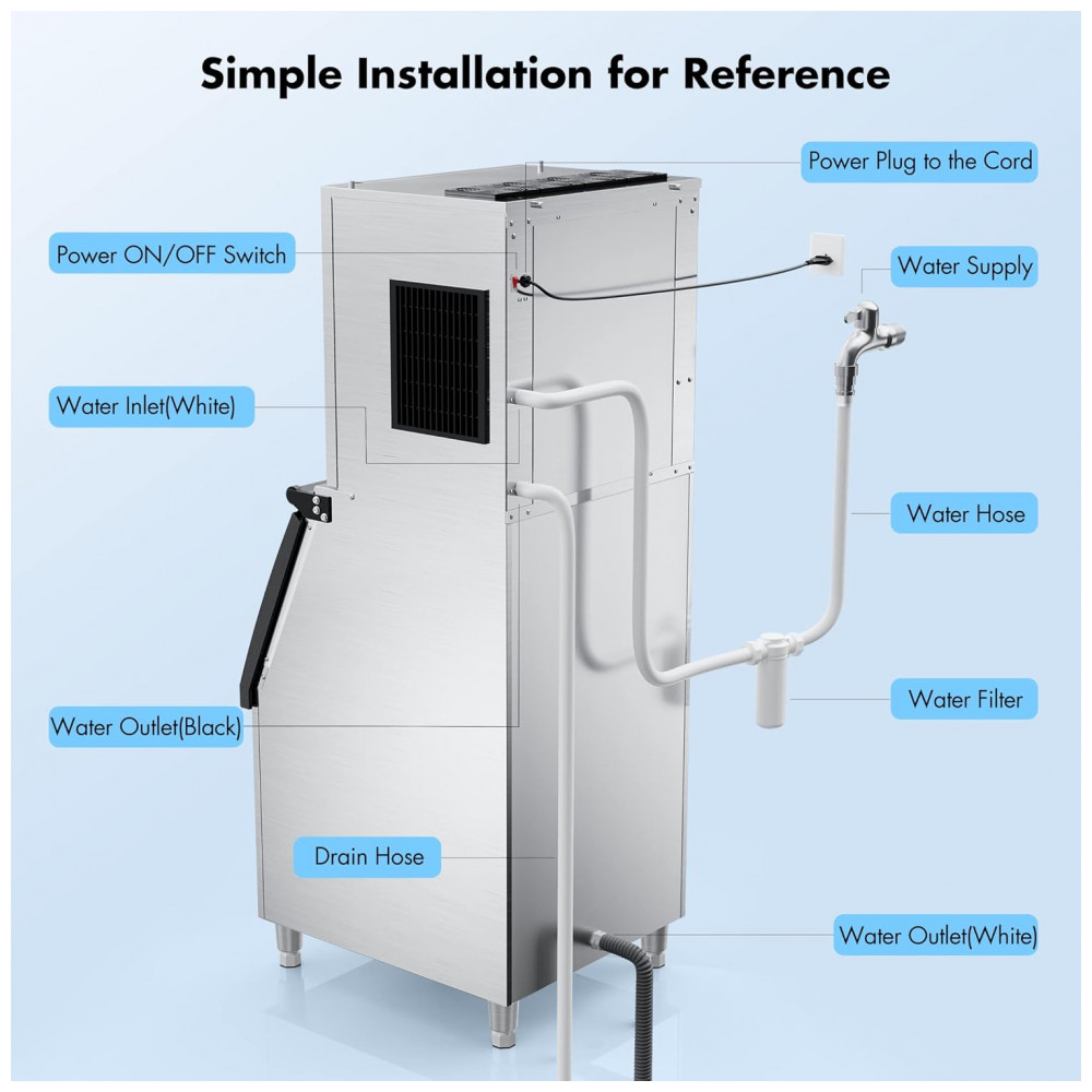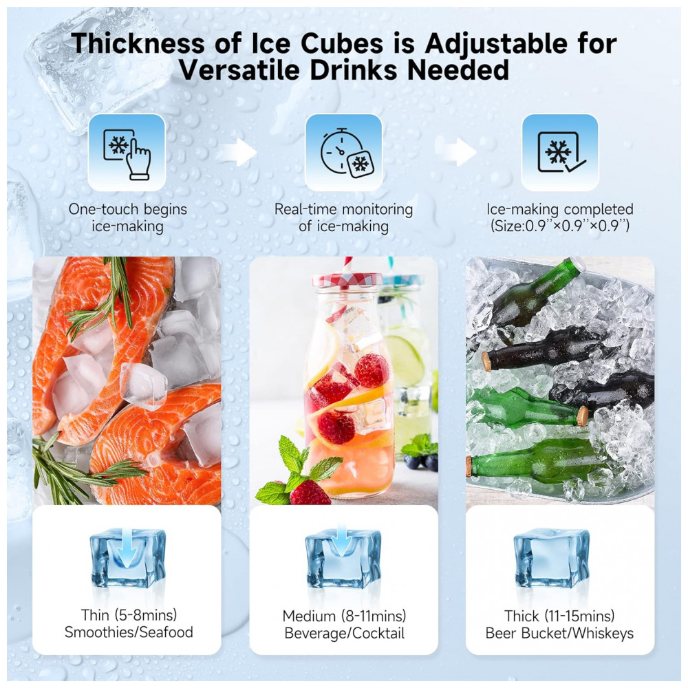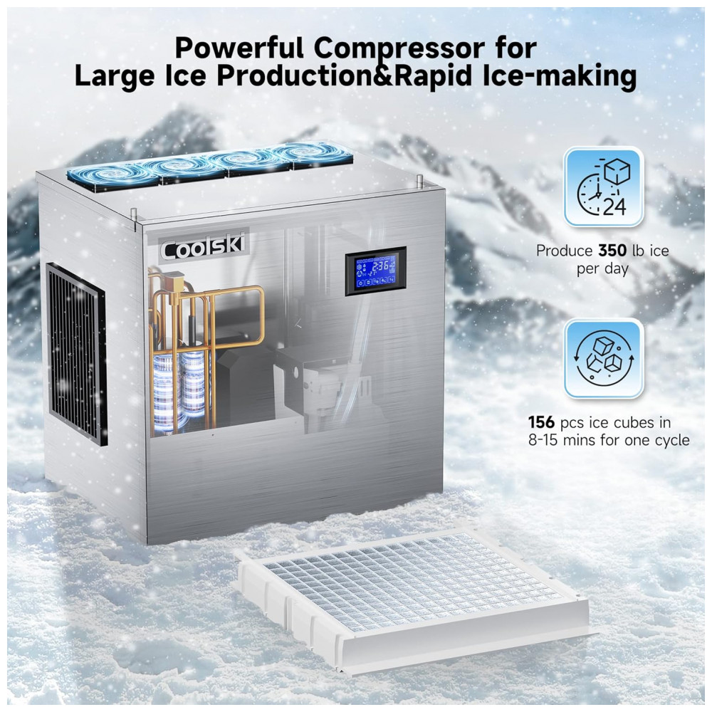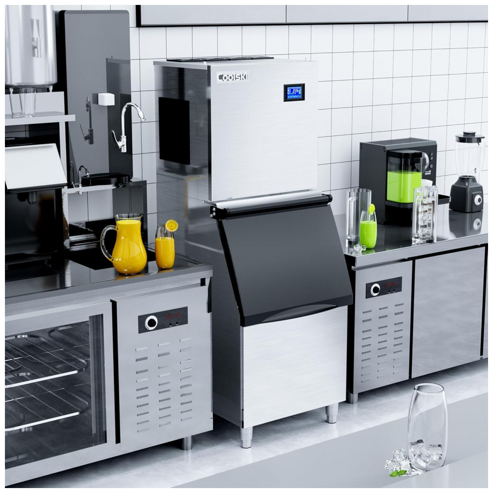Grande Produção de Gelo: Certifique se de que você sempre tem muito gelo fresco na mão com a máquina de gelo Coolski. Nossa máquina de gelo produz 136,08 quilogramas de cubos de gelo claros por dia com um recipiente de qualidade alimentar capaz de guardar até 113,40 quilogramas de gelo.