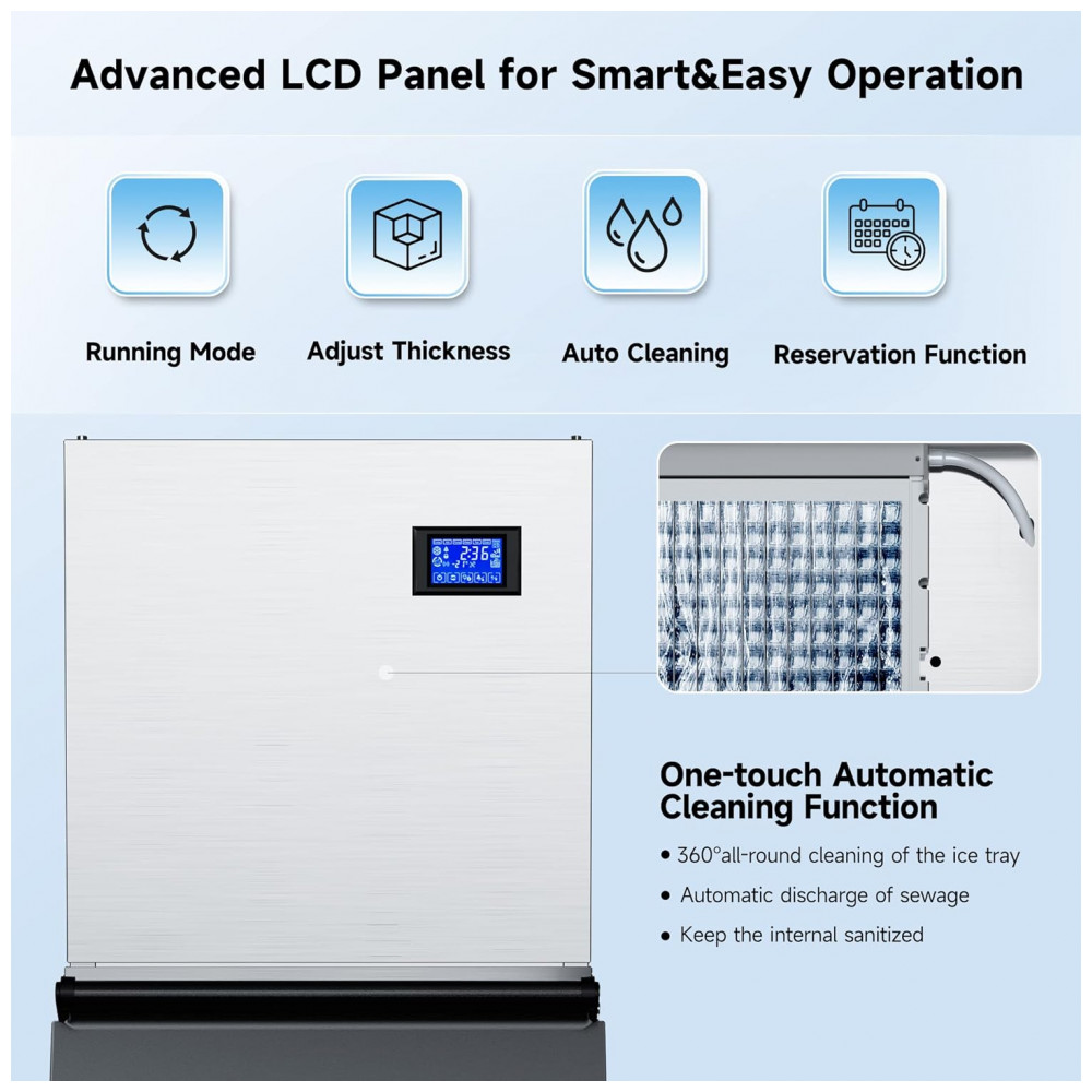 Controlador LCD fácil de usar: Controles intuitivos permitem uma operação rápida e fácil da máquina de gelo. Através do painel LCD, você pode observar o processo de fabricação de gelo, ajustar facilmente a espessura dos cubos de gelo, fazer uma reserva e operar a função de limpeza automática. Um sistema de diagnóstico integrado identificará os problemas com a máquina e exibirá o problema no controlador digital.
