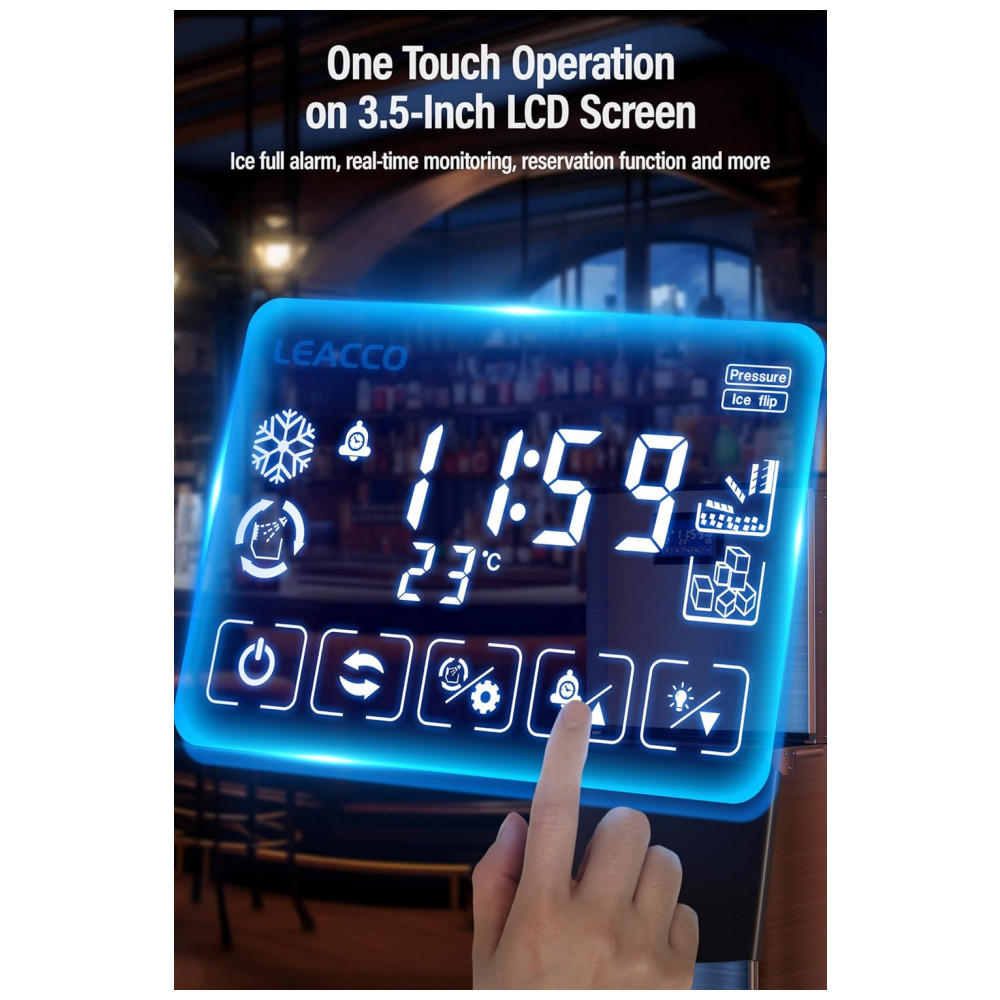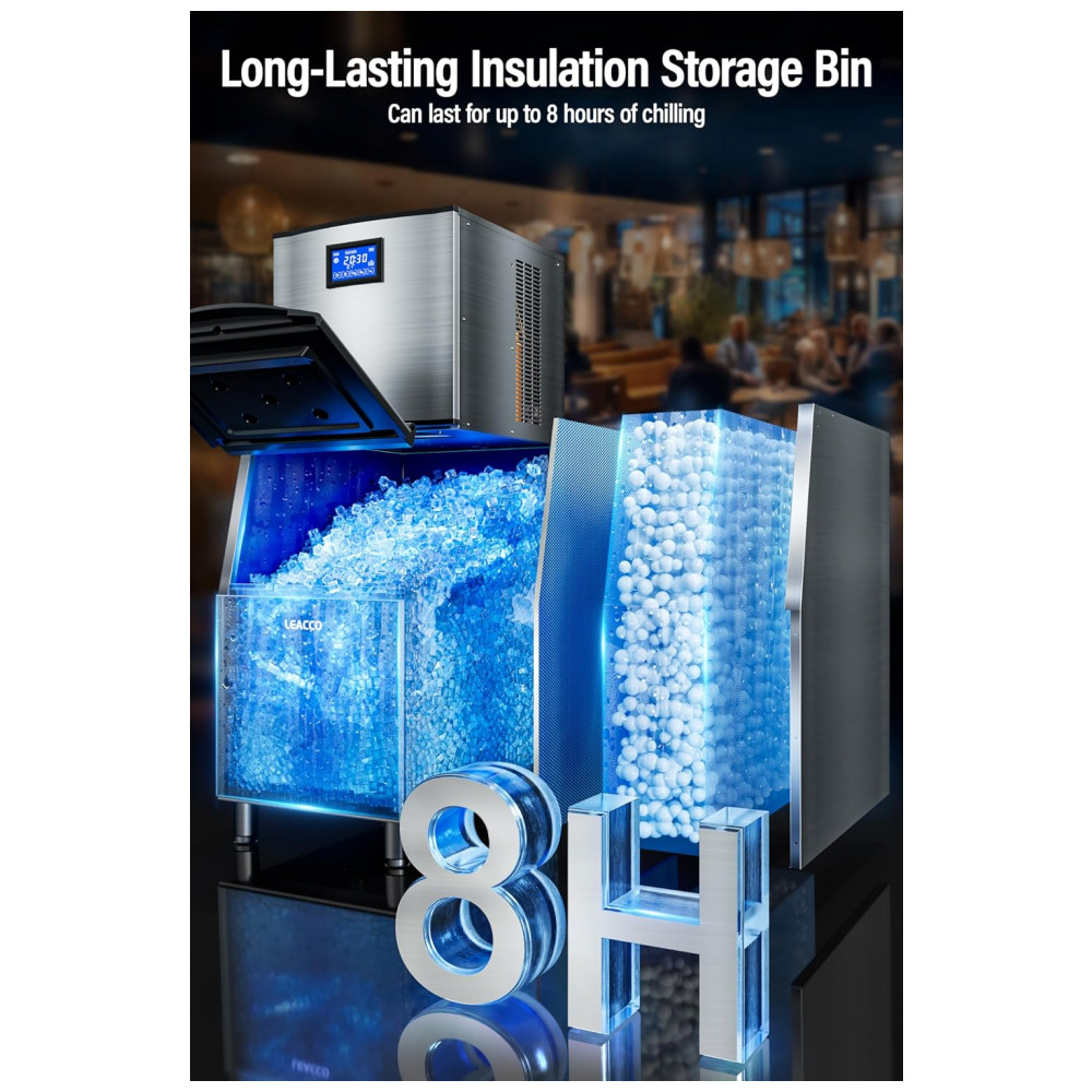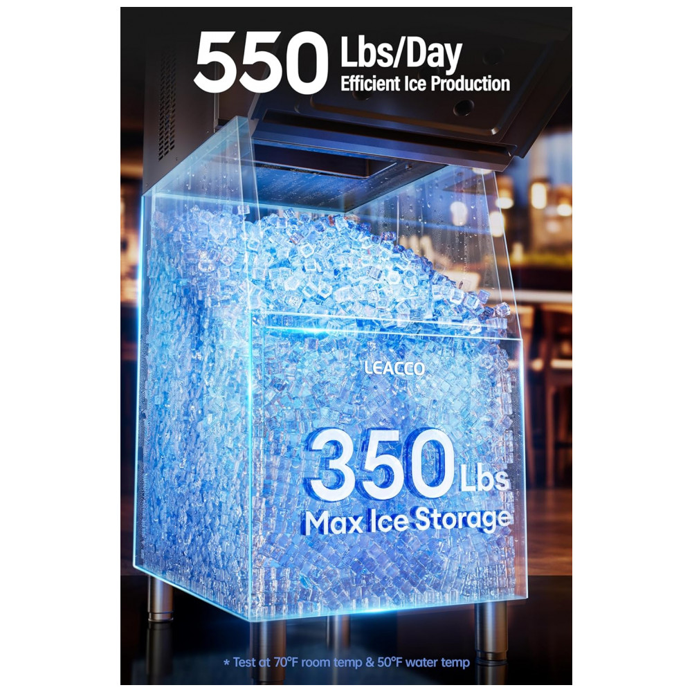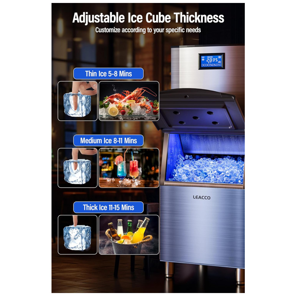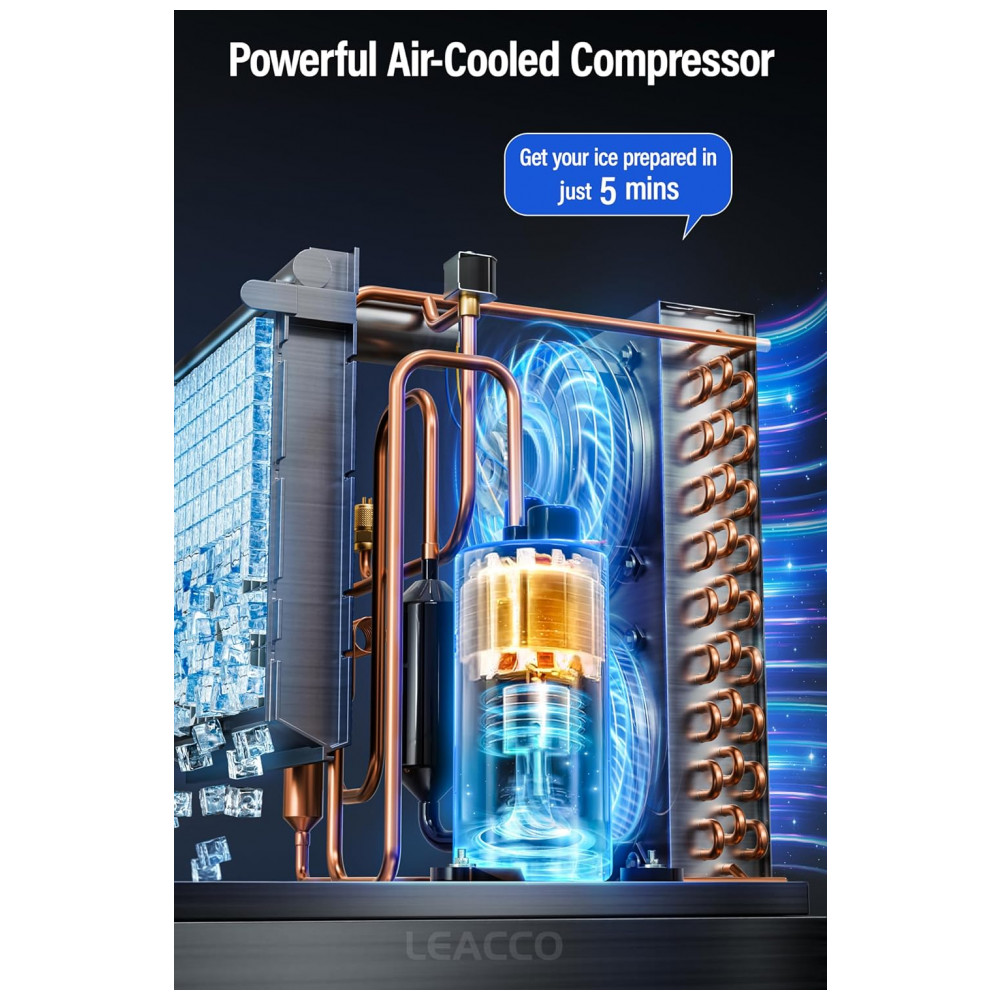 Eficiência Notável: Com a potência de um compressor superpotente, a máquina de fazer gelo Leacco produz 249.48 kg de gelo em 24 horas, garantindo um fornecimento constante enquanto otimiza o consumo de energia. Em apenas 5 minutos, ela pode gerar 182 cubos de gelo de alta qualidade, reconhecidos pela sua forma precisa, clareza e diluição lenta.