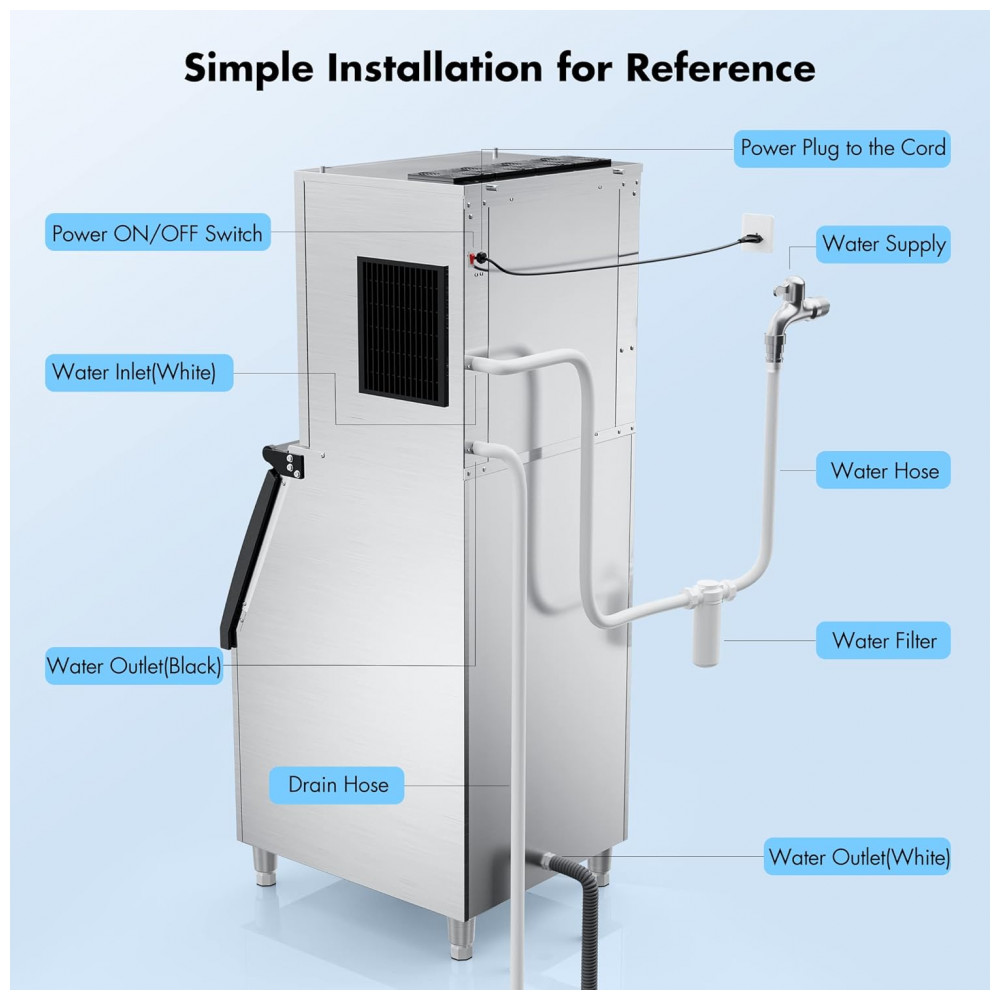 Painel LCD fácil de usar: Os controles intuitivos simplificam a operação, com um design fácil de usar, permitindo uma operação rápida e fácil da máquina. Através do painel LCD, você pode observar o processo de fabricação do gelo, ajustar facilmente a espessura dos cubos de gelo, fazer reservas e operar a função de limpeza automática.