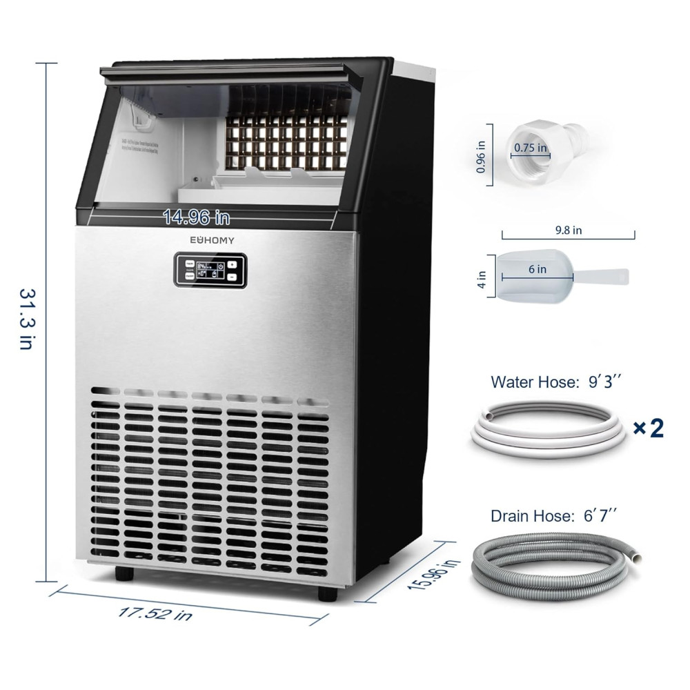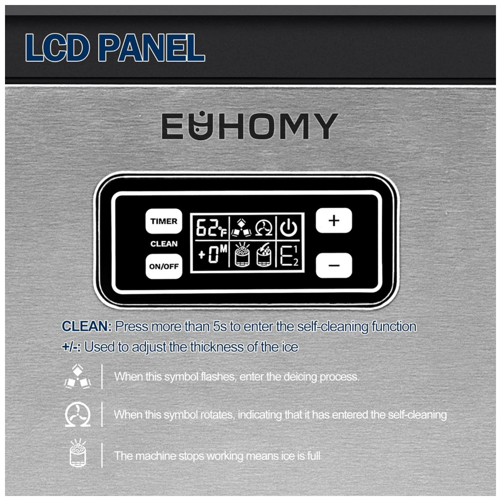 Cubos de gelo cristalinos A máquina de fazer gelo independente Euhomy é extremamente confiável e versátil, produzindo até 45kg de gelo por dia em um independente, 15kg compartimento de zenamento de capacidade. Máquina de gelo de 45kg possui prevenção automática de transbordamento, o sensor de gelo irá pará la quando o gelo estiver cheio. Painel de controle LCD intuitivo A máquina de gelo Euhomy é a melhor escolha para fazer gelo com painel de controle LCD intuitivo, permite uma operação fácil com funções de alimentação, atraso e limpeza. O símbolo do painel indicador intuitivo acende quando o compartimento está cheio ou quando é necessária manutenção. Abastecimento de água e drenagem A máquina de gelo independente está equipada com um conjunto completo de acessórios, incluindo pá de gelo, cano de abastecimento de água e cano de esgoto. Adequado para instalação independente ou embutida, ele funciona com uma corrente elétrica doméstica padrão. Requer abastecimento e drenagem de água drenagem por gravidade. Aço inoxidável e alta eficiência Fabricado em aço inoxidável, a máquina de fazer gelo da Euhomy é forte e durável. Gabinete atraente e durável de aço inoxidável com uma porta de fácil acesso que desliza para cima e para fora do caminho. O Ice Maker é equipado com certificado de energia, ajudando você a economizar eletricidade. Alta eficiência e baixo ruído proporcionam um ambiente confortável para desfrutar de cubos de gelo de alta qualidade. e de atenção A máquina de fazer gelo de grau funciona muito bem em residências, restaurantes, bares, hotéis, supers e muito mais não para uso ao ar livre. Combina alta produção e capacidade com um design compacto e independente. Aprovado para uso . Certifique se de manter a máquina de gelo na posição vertical por pelo menos 24 horas antes de usá la. Além disso, pressione o botão Limpeza do temporizador por mais de 5 segundos para entrar no Programa de limpeza para limpá lo duas vezes antes de fazer o primeiro lote de gelo.