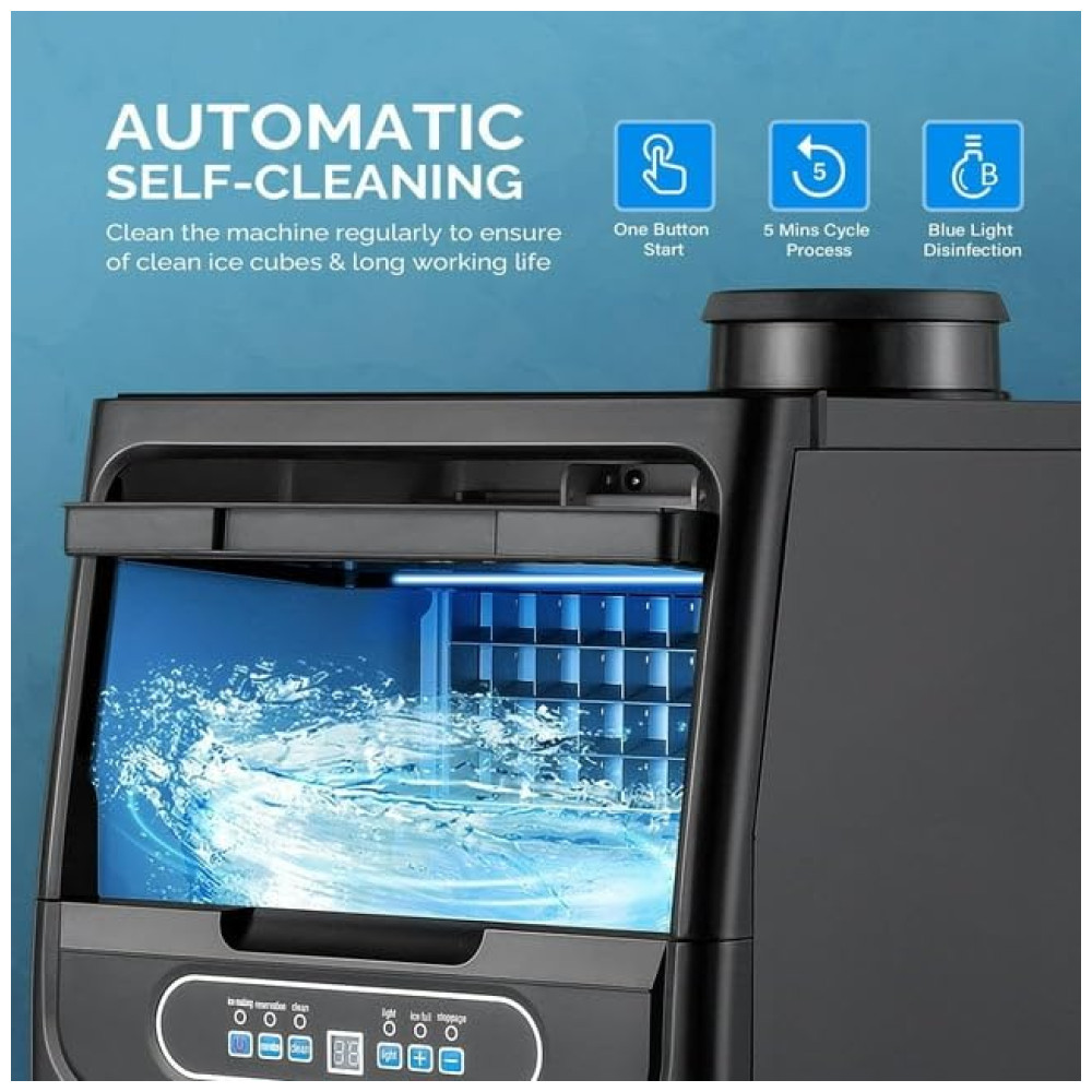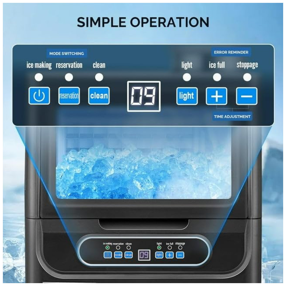 Nossa máquina de gelo tem uma função rápida de fabricação de gelo, podendo produzir até 36 cubos de gelo por ciclo em 11 a 18 minutos e 40,8 kg de cubos de gelo transparentes por dia. O tamanho dos cubos de gelo é 2,3 cm x 2,3 cm x 2,3 cm, e a caixa de armazenamento de gelo pode conter até 5 kg de gelo de uma vez.