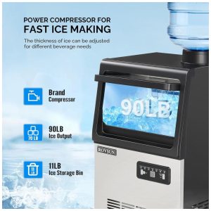 Damos grande importância à qualidade dos nossos produtos. Cada máquina de gelo ROVSUN é cuidadosamente fabricada e testada para garantir sua segurança e durabilidade. O dispositivo é feito de aço inoxidável durável, que tem resistência à ferrugem, estendendo sua vida útil. Se você está procurando uma máquina de gelo residencial e comercial de alta qualidade, então nosso produto é a escolha ideal. Observe que ao instalar esta máquina, é necessário usar um cano de água e um ralo de piso, que são essenciais.