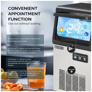 Fácil operação: Nossa máquina de gelo é equipada com um painel de controle intuitivo e fácil de usar. Ao pressionar o botão (+) ou (-), você pode ajustar o tempo de fabricação de gelo e a espessura dos cubos de gelo. Nossa máquina de gelo também tem uma função de temporização de 24 horas, que pode ser programada para desligar à noite e ligar de manhã.