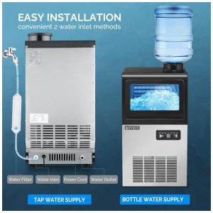 2 entradas de água avançadas: Nossa máquina de gelo usa um compressor de alta eficiência, com baixo ruído, resfriamento rápido e baixo consumo de energia. Ela usa refrigerante R290 e resfriamento a ar, tornando a fabricação de gelo mais eficiente em termos de energia. Isso ajuda você a economizar custos e evitar a escassez de gelo.