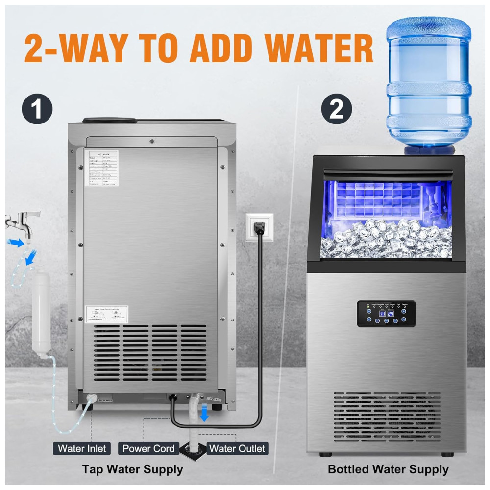 Esta máquina de gelo comercial oferece duas opções para adicionar água: pode ser conectada à água da torneira ou você pode carregar a água manualmente pela parte superior. O gelo gerado é cristalino e, com o filtro de água incluso, ele será mais limpo, duro e com um sabor excelente.