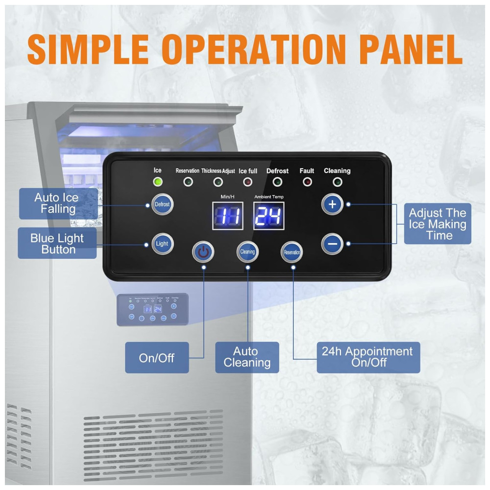 A máquina de gelo comercial tem um painel de controle de fácil uso, com ajuste da espessura do gelo, função de limpeza automática com apenas um toque, reserva de gelo para até 24 horas, descongelamento automático, além de alertas de mau funcionamento e falta de água.