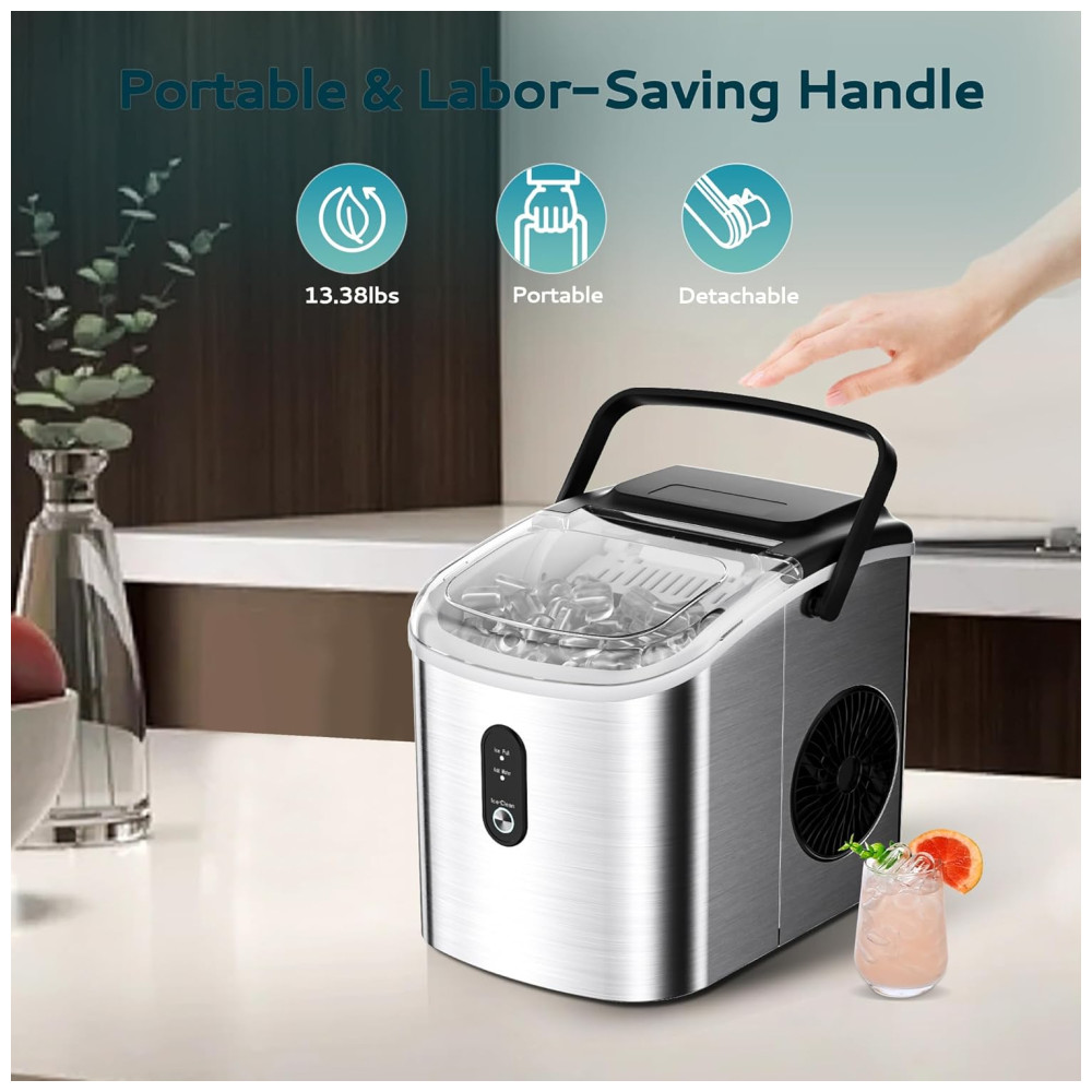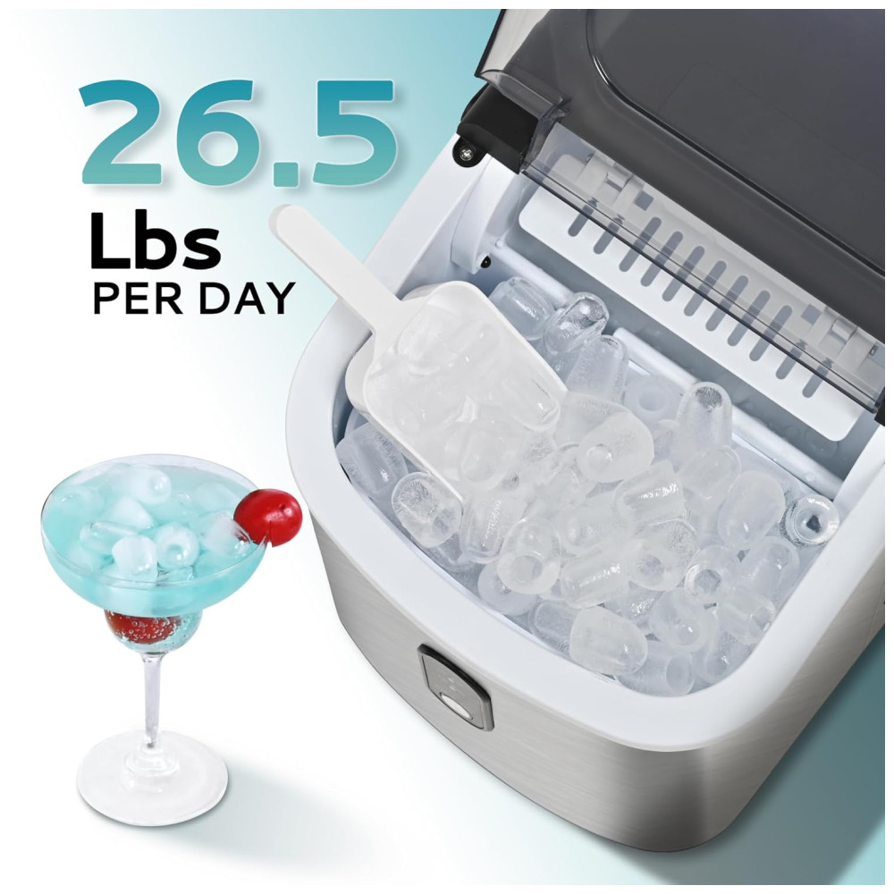 Design portátil e cubos de gelo perfeitos: Compacta e prática, nossa máquina de gelo conta com uma alça resistente e pesa apenas 6,1 kg. Suas dimensões de 23,5 cm (C) x 29,3 cm (L) x 29,5 cm (A) facilitam o transporte, tornando-a ideal para a cozinha, casa, acampamentos ou trailers. Ela produz cubos de gelo em formato de bala, que são lisos, não grudam e não machucam suas mãos ou boca, sendo perfeitos para bebidas geladas ou café gelado.