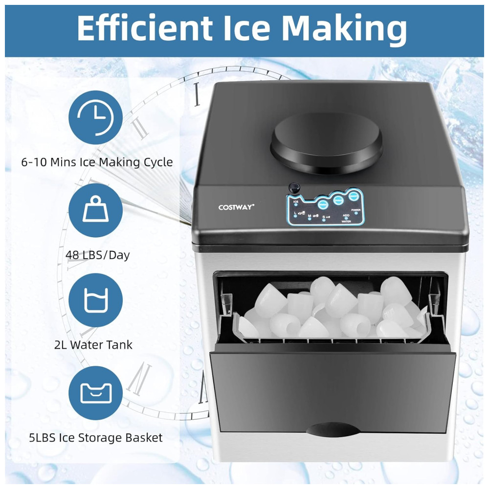Com um ciclo de fabricação rápido de 6 a 10 minutos, nossa máquina de gelo pode produzir até 21,8 kg (48 libras) de gelo fresco por dia. O gelo derretido é reciclado automaticamente para o próximo ciclo de produção, tornando o processo mais eficiente. Além disso, a cesta de gelo possui capacidade para armazenar até 2,3 kg (5 libras) de gelo, e é removível para facilitar o manuseio.