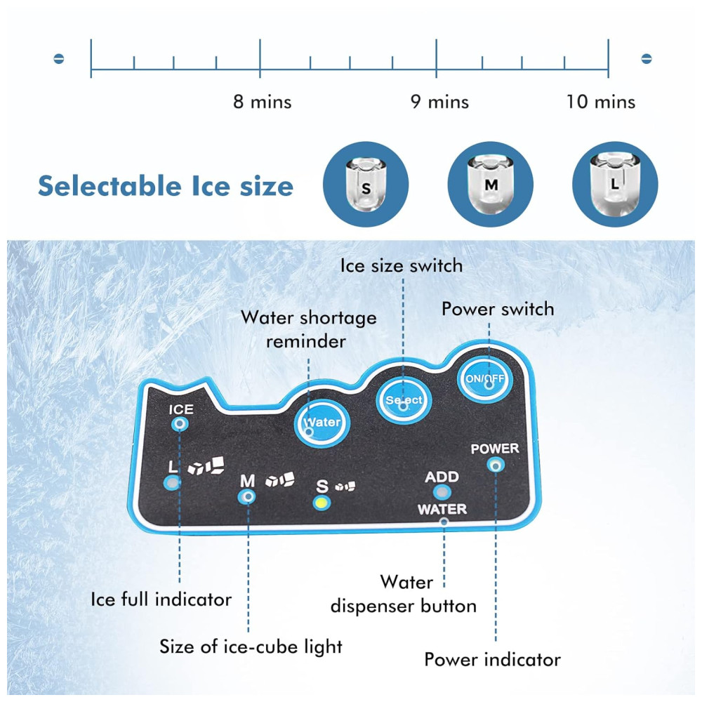 O painel de controle de botão permite que você ligue a máquina e escolha o tamanho do gelo (pequeno, médio ou grande). Indicadores de “falta de água” e “gelo cheio” avisam quando é necessário adicionar água ou remover o gelo, ajudando a economizar energia e reduzir os custos. Lembre-se de remover a película protetora azul antes de usar a máquina pela primeira vez.