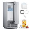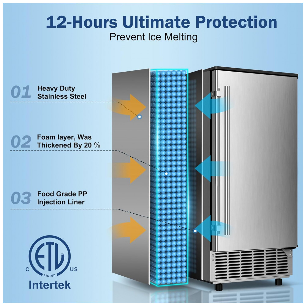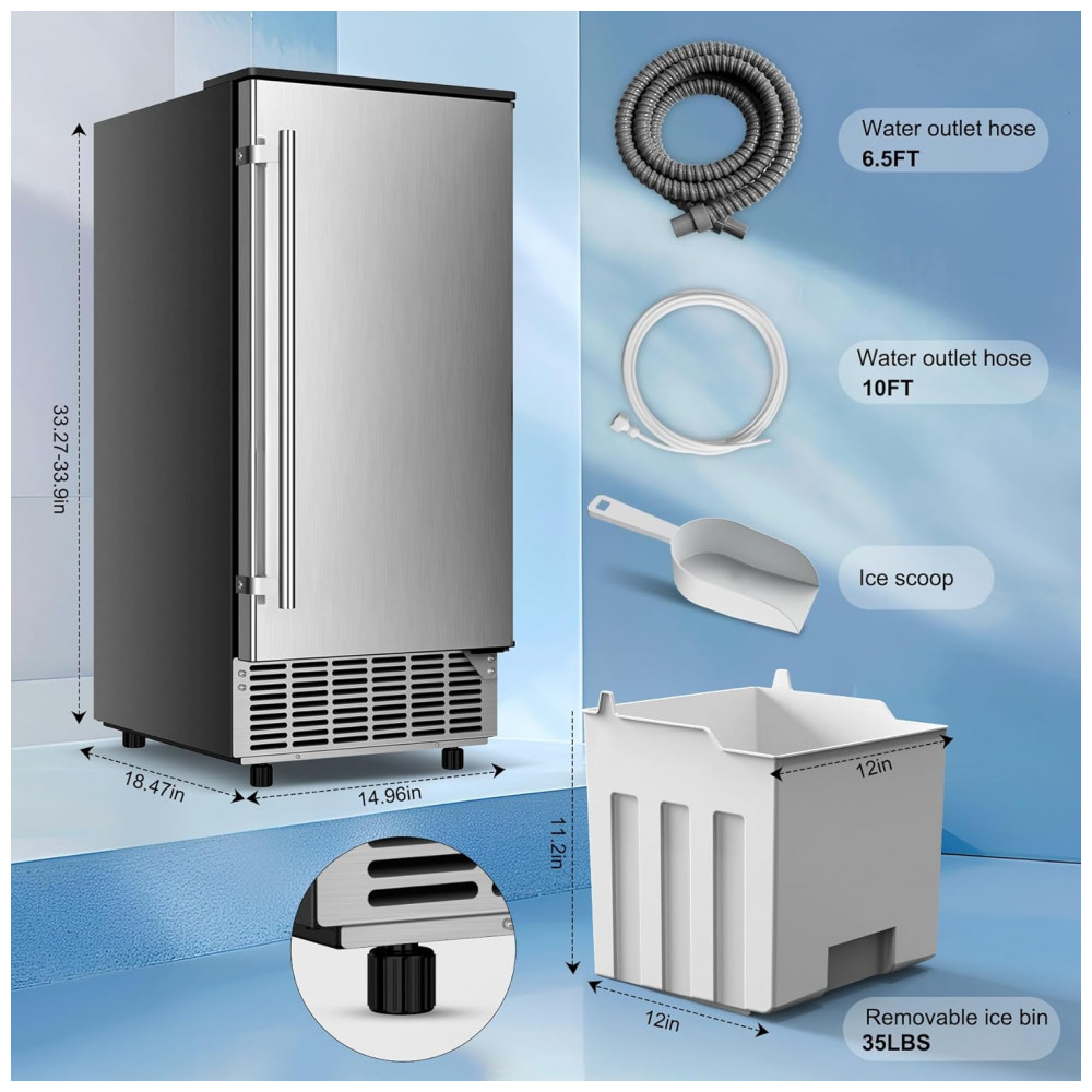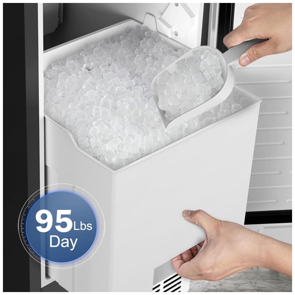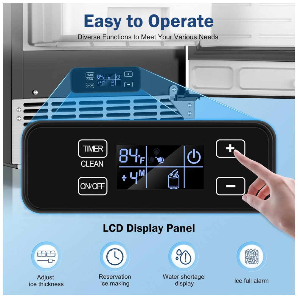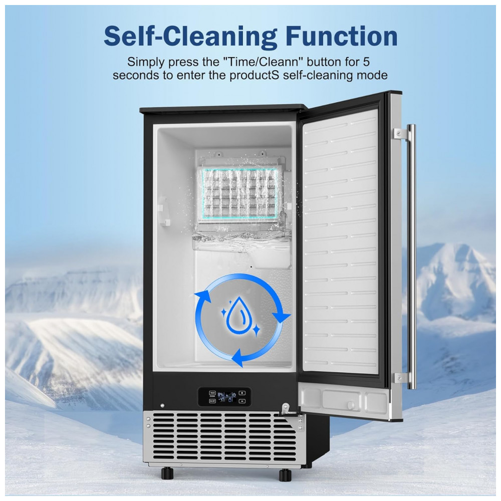 A porta com alça em aço inoxidável é reversível, permitindo instalação com dobradiças esquerda ou direita para adaptação a diferentes layouts. O painel de controle digital suporta timer de 24 horas para programação de ligar/desligar, ajuste de espessura dos cubos via tempo de congelamento e ativação de autolimpeza pelo botão “Timer Clean” mantido por 5 segundos, iniciando ciclos automáticos de higienização. O abastecimento automático de água ocorre via tubo de entrada traseiro, assegurando fluxo contínuo sem recargas manuais. Equipada com compressor de 750W e refrigerante R290a, oferece resfriamento eficiente, mantendo a forma dos cubos no bin por períodos prolongados.