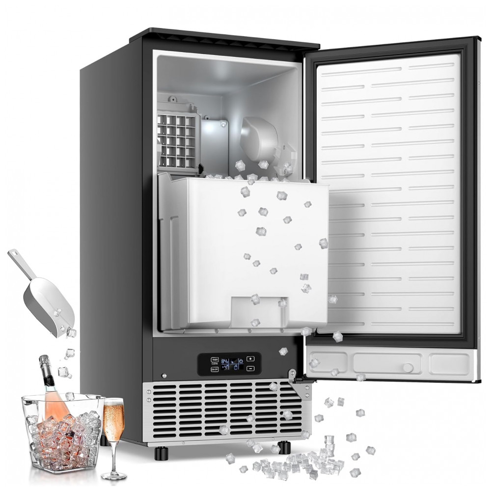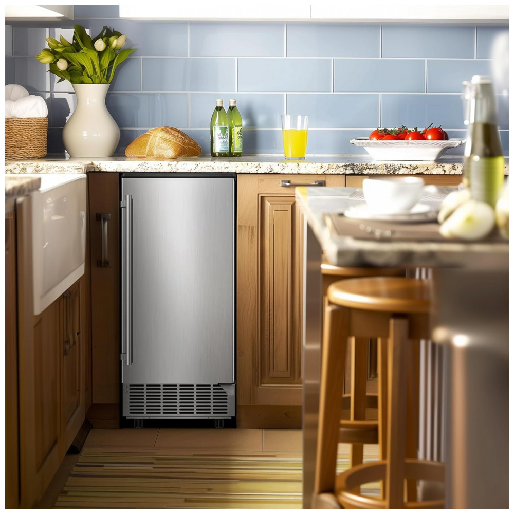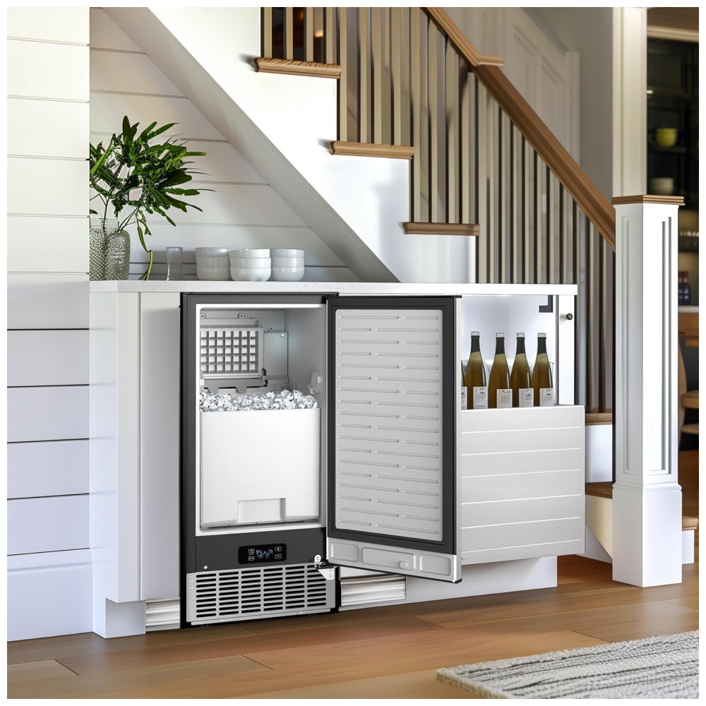 A Máquina de Gelo Sob Bancada RAPSUAR é um equipamento embutido comercial em aço inoxidável com isolamento térmico de três camadas, otimizado para produção de cubos de gelo em cozinhas, bares, escritórios e uso comercial leve. Gera até 43 kg de gelo por 24 horas, produzindo 40 cubos transparentes a cada 15-20 minutos, com reservatório de armazenamento de 16 kg para operação ininterrupta. O design sob bancada integra-se perfeitamente a balcões de altura padrão, com dimensões compactas de 43 cm (profundidade) x 48 cm (largura) x 63,5 cm (altura).