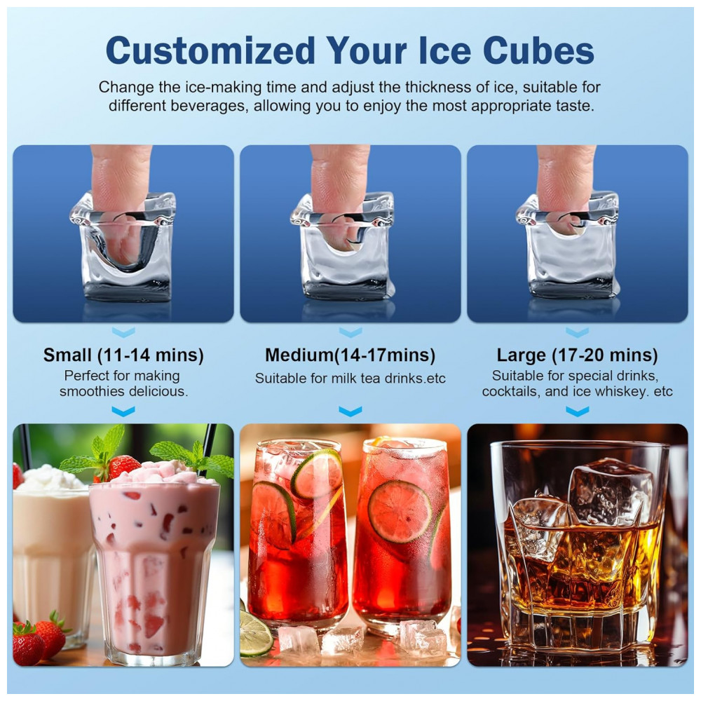 Funções Timer 24h, ajuste espessura cubos, autolimpeza