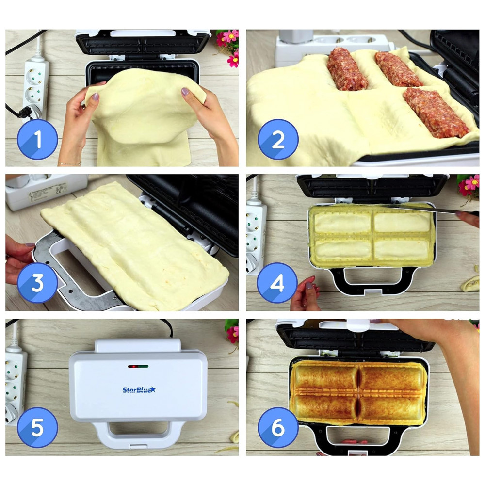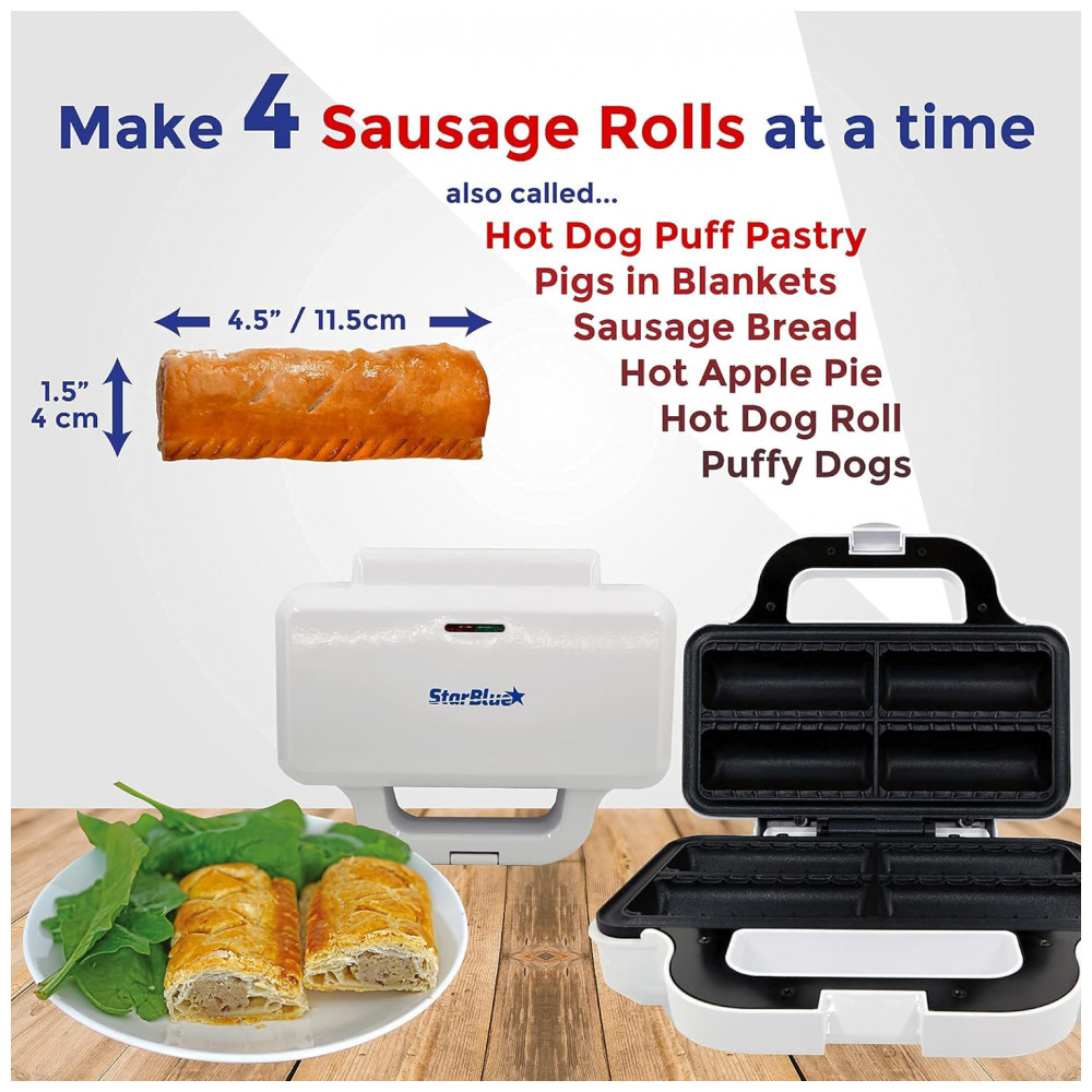 APLICAÇÕES VERSÁTEIS A máquina de café da manhã de design inteligente e de grau alimentício tem capacidade para fazer 4 rolinhos de salsicha simultaneamente, o que permite que você faça mais em menos tempo. A versátil lancheira é perfeita para fazer vários tipos de pães, tortas, sobremesas, pão de cachorro quente e vários outros itens de café da manhã e lanche.