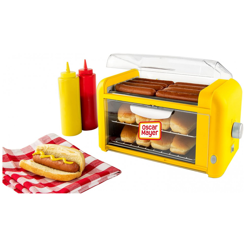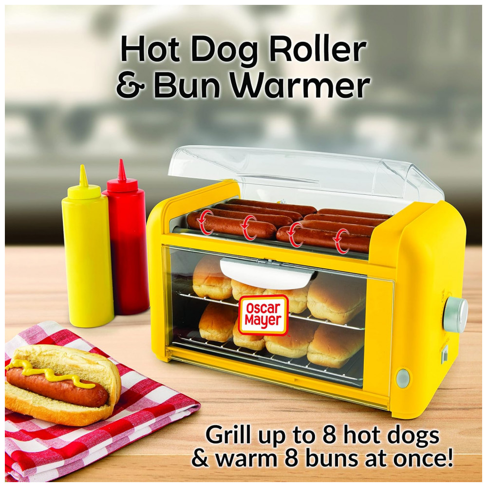 QUENTE, QUENTE E SABOROSO Use o Hot Dog Grill para aquecer seus cachorros quentes Oscar Mayer e torrar seus pãezinhos para uma refeição divertida e deliciosa Existem 5 rolos na parte superior para cachorros quentes e 2 prateleiras de aquecimento abaixo para pãezinhos.