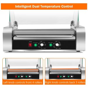 Controles de temperatura dupla : Os botões de temperatura esquerdo e direito separados, localizados no painel frontal, controlam convenientemente os rolos dianteiro e traseiro. Ao grelhar, você pode ajustar a temperatura acima de 266 130 . Após a grelhar, mantenha os cachorros quentes quentes em cerca de 122 50 . Se a temperatura diminuir, a máquina do rolo começará a aquecer automaticamente.