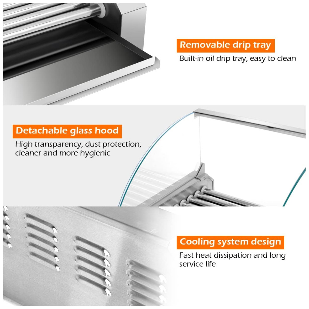 Qualidade superior e fácil de limpar: Feito de aço inoxidável premium de qualidade alimentar, a grade de salsicha não fica enferrujada. O design do sistema de refrigeração lateral oferece dissipação rápida do aquecimento, garantindo longa vida útil. Incluindo uma bandeja de gotejamento removível em aço inoxidável e capuz de vidro destacável, a churrasqueira mantém sua cozinha limpa e lavando ao mínimo.