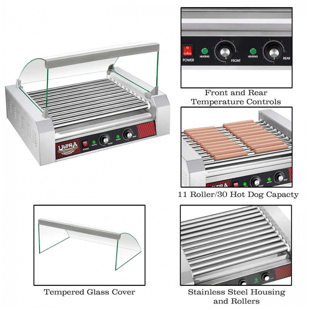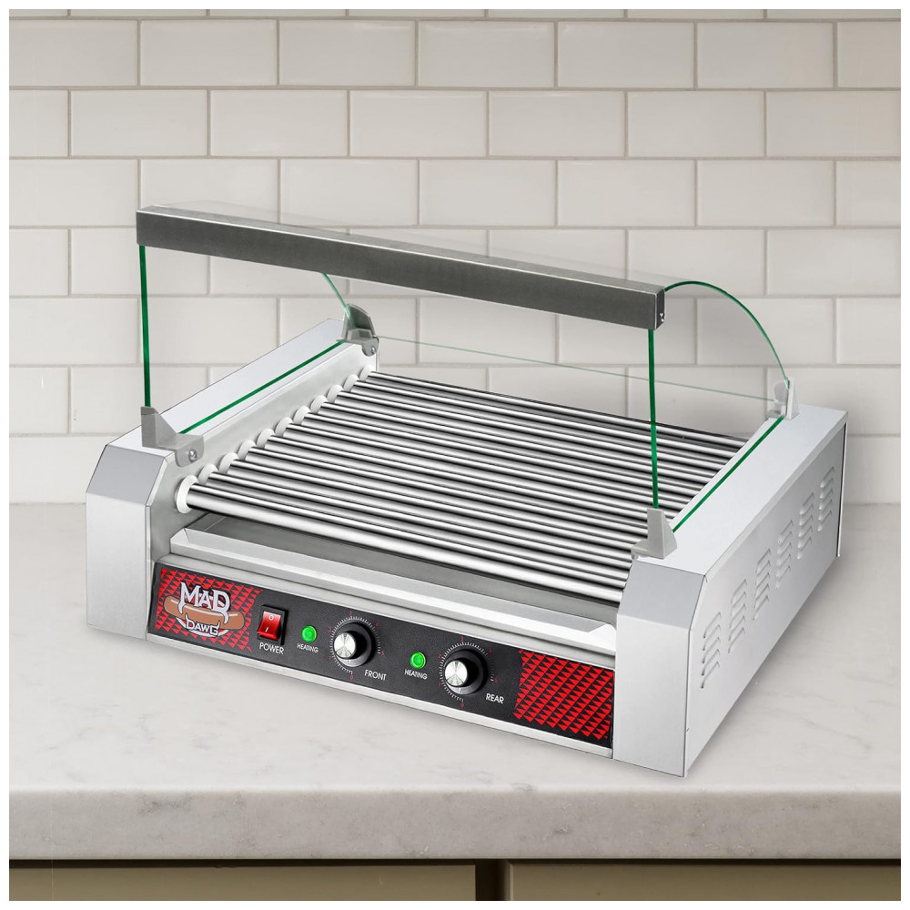 MÁQUINA DE ROLO DE HOTDOG Com 11 rolos de aço inoxidável antiaderentes, você pode grelhar até 30 cachorros quentes 10 linhas de 3 de uma só vez. O fogão para cachorro quente possui um motor para serviços pesados que pode lidar com todos os tipos de carnes, como salsichas, pirralhos e até cachorros quentes congelados.