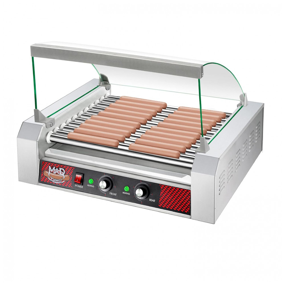 ZONAS DE TEMPERATURA DUPLA Esta máquina de torrefação para cachorro quente opera em 500 2200W e possui zonas de temperatura dupla para grelhar continuamente nos rolos traseiros, enquanto os rolos dianteiros mantêm os itens cozidos quentes e prontos para comer.