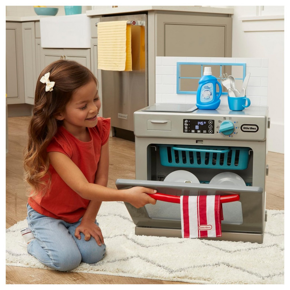 Agora as crianças podem simular lavar a louça como os adultos com a super realista Lava-Louças Infantil Little Tikes First Dishwasher. Esta lava-louças de brincar elegante e moderna está repleta de recursos interativos, como uma porta funcional, gaveta de detergente deslizante, suportes de pratos removíveis e um tapete para secagem. Além disso, inclui luzes e sons realistas. O botão emite um clique ao girar e as crianças podem ativar os efeitos luminosos de lavagem na porta. Fingir lavar a louça e realizar outras tarefas domésticas ajuda as crianças a desenvolver um senso de responsabilidade, parte importante da aprendizagem socioemocional. A First Dishwasher é fácil de montar em tamanho real e encaixa todos os 14 acessórios incluídos para facilitar a limpeza. Incentive as crianças a se envolver em brincadeiras imaginativas e de faz de conta com a Lava-Louças First Dishwasher da Little Tikes!