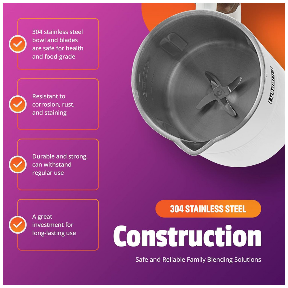 Ela foi habilidosamente construída com materiais seguros para alimentos, garantindo que seu delicioso leite de nozes nunca seja contaminado. Além disso, recursos de segurança integrados garantem que você nunca terá que lidar com problemas de transbordamento, aquecimento a seco ou superaquecimento.