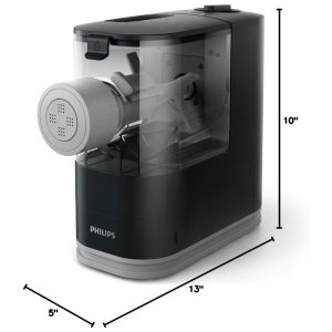 Esta máquina de massa automática é capaz de amassar e extrusar 23 porções de massa fresca em apenas 18 minutos graças à sua barra de agitação de design exclusivo. O comprimento do cabo é de 101 cm e a máquina vem com 3 discos de modelagem clássicos padrão para espaguete, penne e fettuccini. Além disso, possui discos de modelagem especiais que permitem um processo de extrusão dupla para garantir massas e macarrão macios de forma consistente. Com diferentes tipos de farinha e ingredientes como ovo, ervas, espinafre e suco de cenoura, é possível fazer vários tipos e sabores de massa. O design compacto permite que a máquina seja mantida no balcão para uso diário, além de possuir armazenamento inteligente integrado para moldar discos.