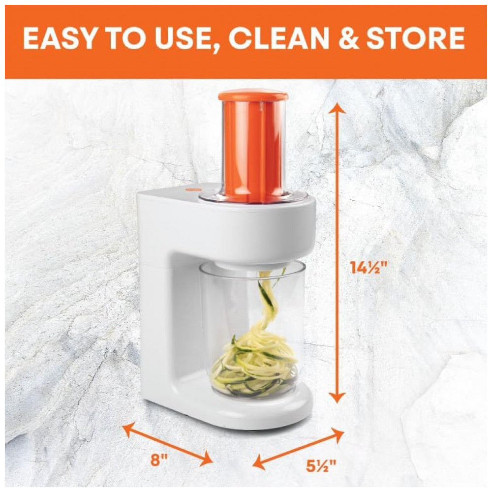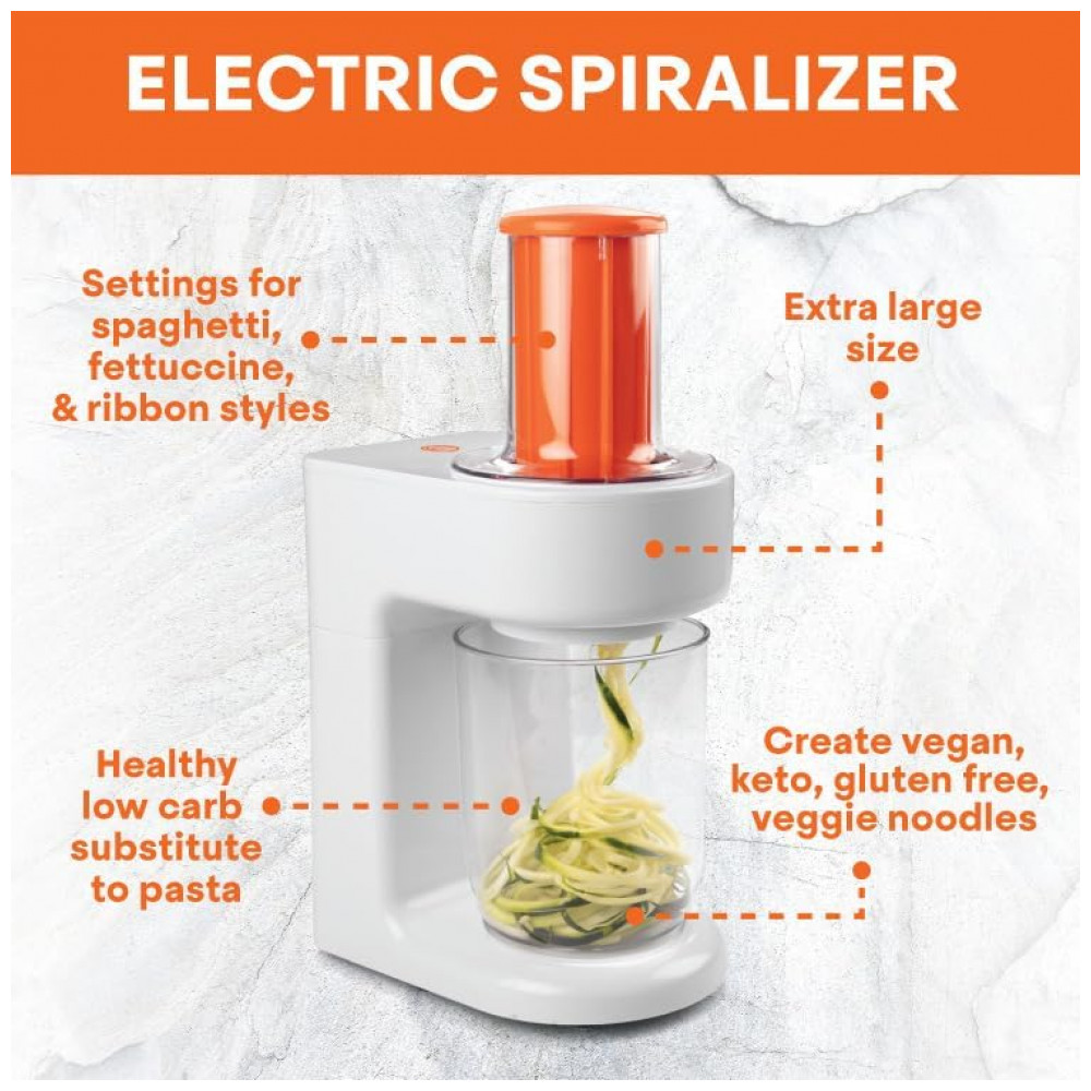Espiralizador elétrico espiralize seus vegetais favoritos Criador de macarrão de vegetais Três cones permitem que você crie espaguete, fettuccine ou macarrão em forma de fita Criador de Zoodle Torne a hora das refeições mais saudável ao ser criativo e misturar seus vegetais favoritos Características Funil extra grande para pegar seu macarrão e macarrão vegetariano Próprio para máquina de lavar louça.