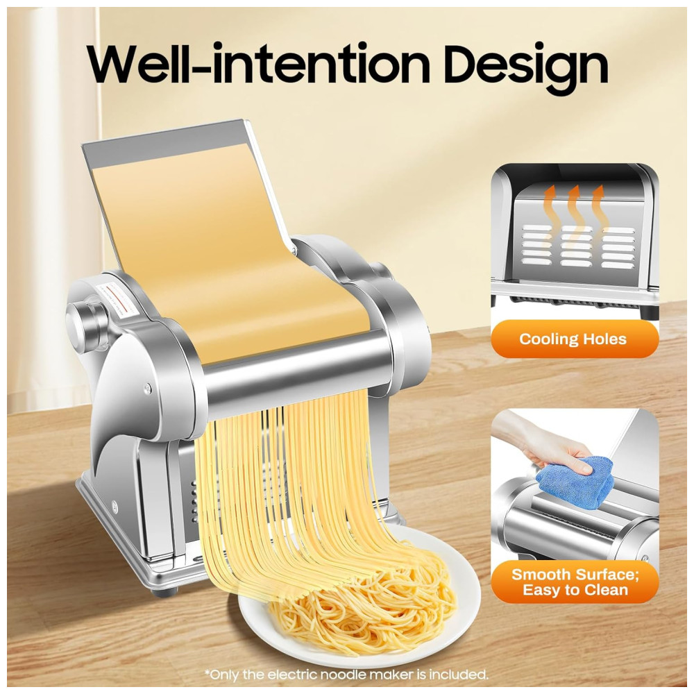 Durável e resistente, esta máquina de macarrão é feita com aço inoxidável de alta qualidade e ferro, passando por processos de polimento e niquelagem, oferecendo resistência à corrosão e desgaste. Seu motor de 135W proporciona potência para cortar noodles e prensar massa de forma suave e eficiente. Fácil de operar, pode laminar a massa com largura de 14cm e espessura de 1,3-3,5mm ajustando um botão. Dois cortadores disponíveis fazem noodles planos de 1,5mm e 4mm. Com ajuste de espessura, variando de 0,5 a 3,5mm, é possível alterar textura e sabor da massa. Fácil de limpar e armazenar devido à sua estrutura separada e superfície lisa. Faça noodles caseiros rapidamente e saboreie refeições deliciosas com família e amigos.