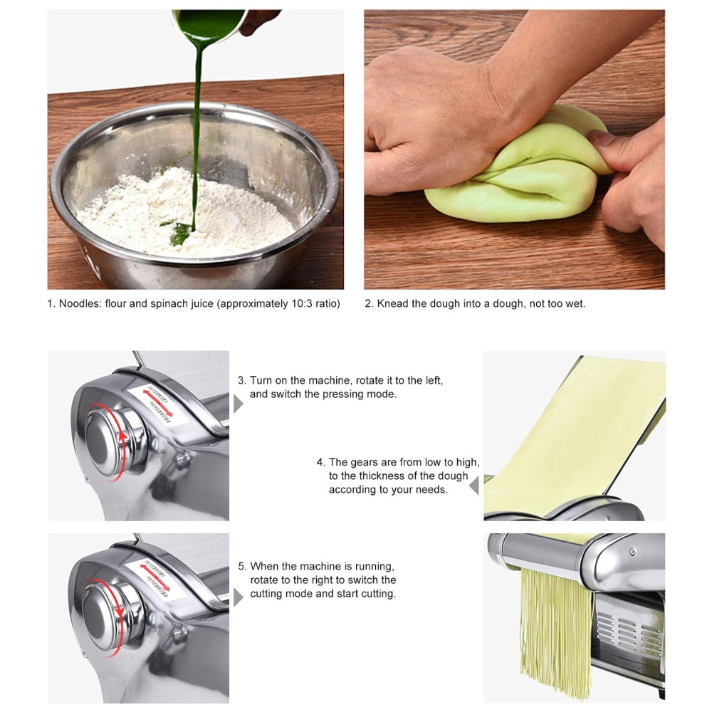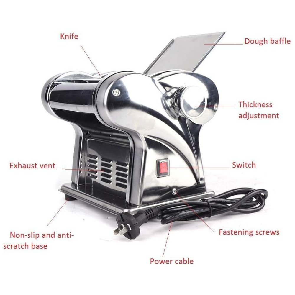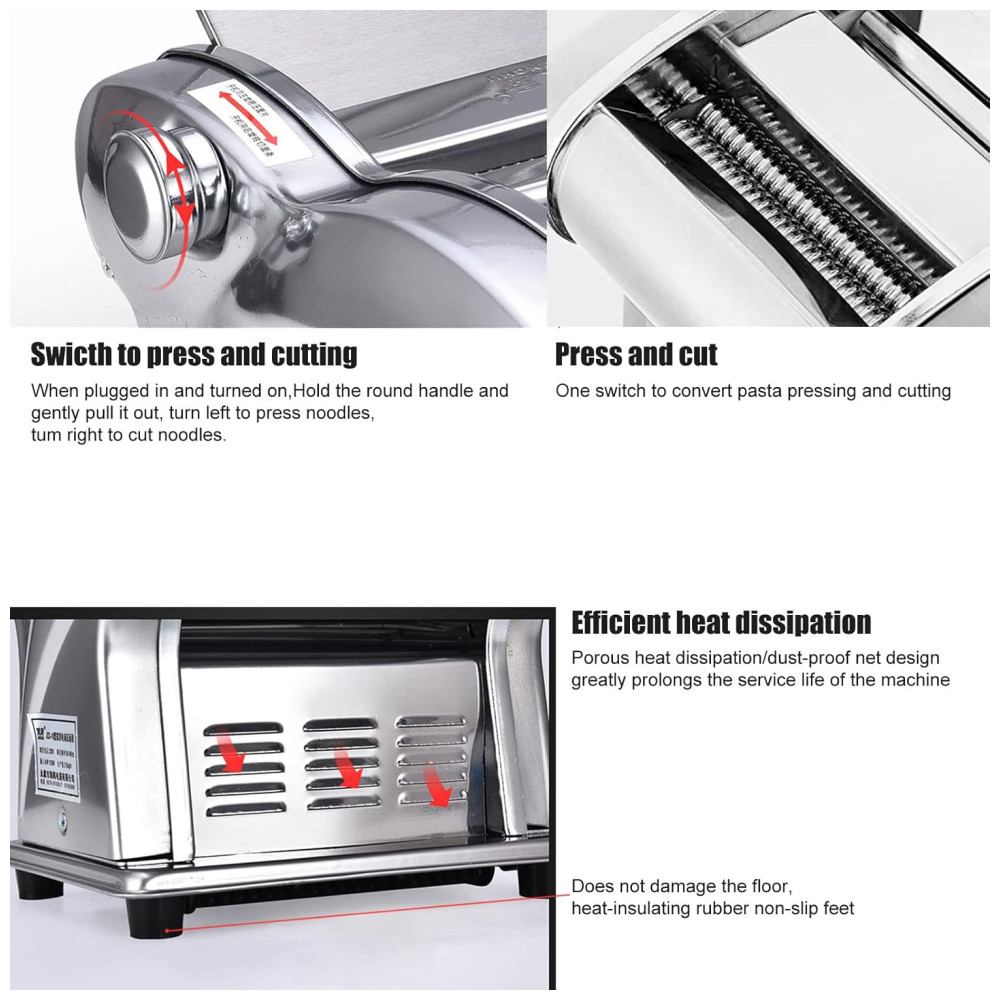 Este produto é uma máquina de prensagem totalmente nova, que pode ser usada como massa, de superfície fina de 1, e superfície de de largura. É uma prensadora de duas facas de aço inoxidável e não enferruja. O botão de ajuste possui 6 posições, a espessura da massa pode ser selecionada de 1,5 a através deste ajuste simples, a textura e o sabor da massa são alterados. Motor de 135W e com proteção automática contra superaquecimento, e confiável, muito adequado para uso doméstico. Devido à sua construção separada, a máquina é fácil de limpar e zenar seu rolo de macarrão e cortador de macarrão podem ser limpos para manter a máquina esterilizada e higiênica