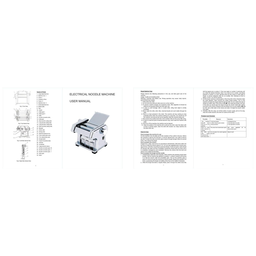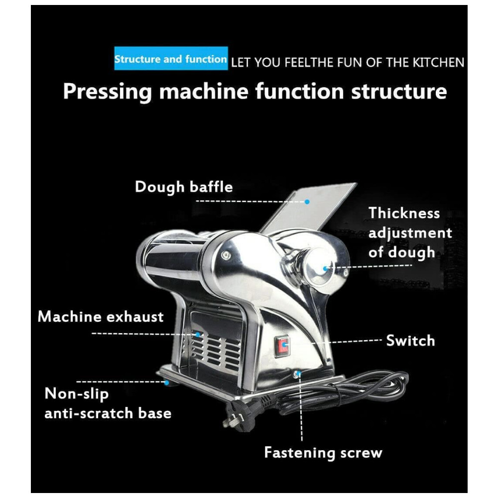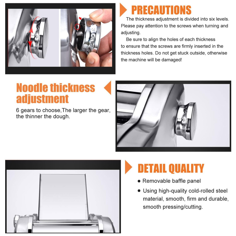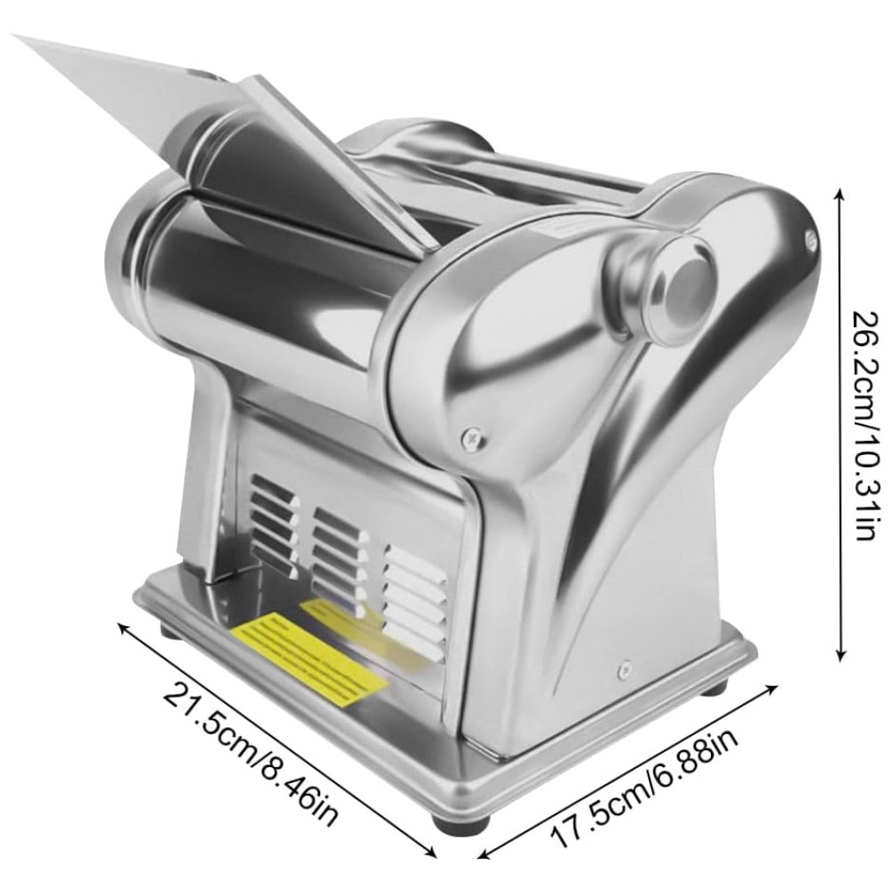 Este produto é uma máquina de prensagem totalmente nova, que pode ser usada como massa, de superfície fina de 1, e superfície de de largura. É uma prensadora de duas facas de aço inoxidável e não enferruja. O botão de ajuste possui 6 posições, a espessura da massa pode ser selecionada de 1,5 a através deste ajuste simples, a textura e o sabor da massa são alterados. Motor de 135W e com proteção automática contra superaquecimento, e confiável, muito adequado para uso doméstico. Devido à sua construção separada, a máquina é fácil de limpar e zenar seu rolo de macarrão e cortador de macarrão podem ser limpos para manter a máquina esterilizada e higiênica