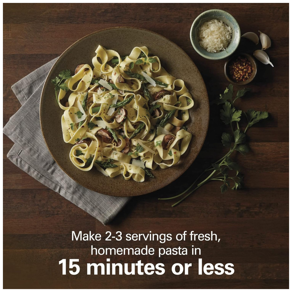 Com o fabricante de massas elétricas Hamilton Beach, massas caseiras frescas agora são tão simples quanto adicionar ingredientes e apertar um botão. Em 15 minutos ou menos, você pode ter macarrão pronto para ferver. A máquina de macarrão mistura, amassa e expulsa a massa para você. Uma escala interna mede a farinha e calcula a quantidade de água que você precisa adicionar. Escolha entre 7 formatos de massa diferentes e seja criativo com sabores usando sucos de vegetais e purês ou farinhas diferentes