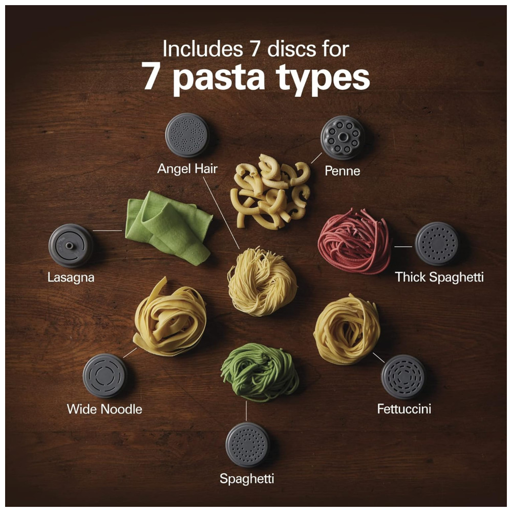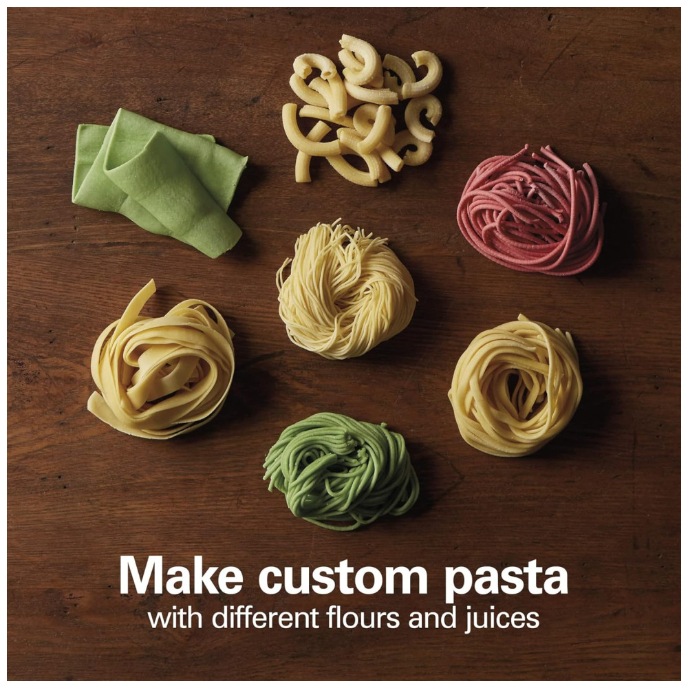 Faça 2 3 porções de massa fresca caseira em 15 min. Esta máquina de macarrão automatiza a fabricação de macarrão misturando, amassando e extrusando a massa. Inclui discos para 7 formatos de macarrão. Escolha entre espaguete grosso, lasanha, espaguete, cabelo de anjo, macarrão largo, penne e fettuccini. Gaveta de zenamento para discos dentro da máquina de macarrão. Não é necessária secagem. Uma vez que o macarrão é extrudado, você pode fervê lo imediatamente não há tempo de secagem necessário. A escala interna ajuda a medir os ingredientes. Este fabricante de macarrão pesa ingredientes e ajuda a calcular a proporção de farinha para água. Depois de um pouco de prática, você se tornará um profissional em pouco tempo. Personalize com farinhas, purês de vegetais e sucos. Experimente de tudo, desde massas sem glúten a espinafre, personalizando seus ingredientes. 4 receitas incluídas.