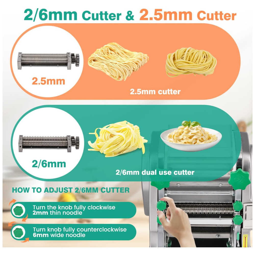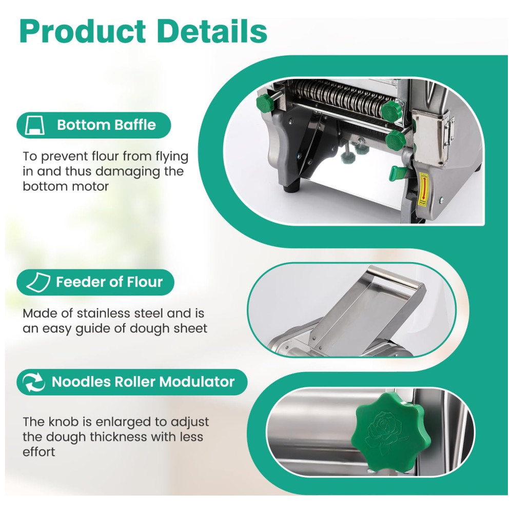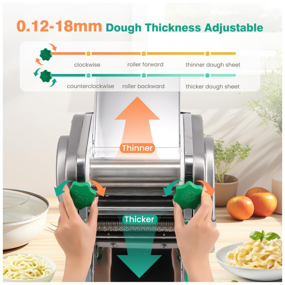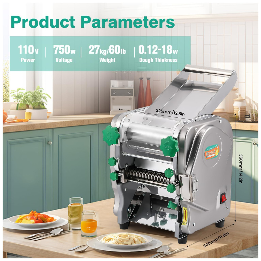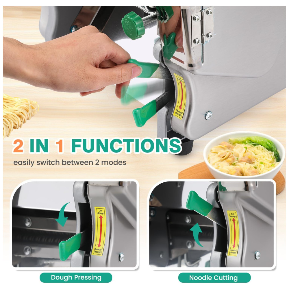 Desfrute da Máquina de Macarrão Industrial 2 em 1 da Newhai, com dimensões de 32 x 36 x 30cm e peso de 22kg. Com potência de 550W, esta máquina comercial de macarrão não requer a remoção das lâminas ao pressionar a massa, realizando facilmente a função 2 em 1 de pressionar a massa e cortar o macarrão. Com ajuste de espessura de 0,1218mm, oferece consistência nas folhas de massa, possibilitando personalizar a espessura do macarrão de acordo com suas necessidades culinárias. Feita com materiais de alta qualidade, como aço espesso, aço inoxidável 430 e lâmina de material eletrochapeado, garantindo durabilidade excepcional. Equipada com engrenagens de aço robustas e transmissão de dupla correia, proporcionando baixo ruído e alta resistência. Com um potente motor de 550W, dissipa calor automaticamente, permitindo o processamento eficiente da massa. Ideal para uso comercial e doméstico, tornando a criação de deliciosos macarrões caseiros muito mais fácil e prática.