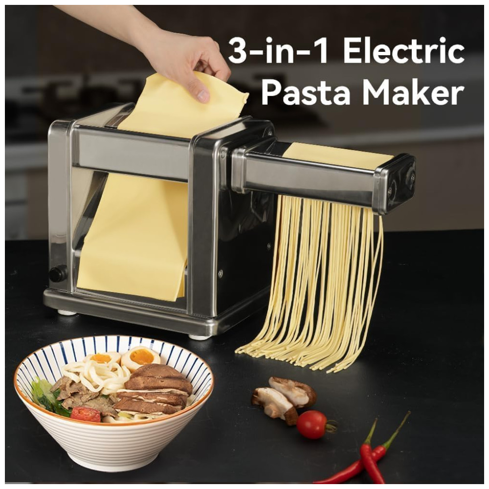 Máquina de Macarrão Elétrica em Aço Inoxidável com Cortador de Rolos Ajustável 7 Espessuras 2 Larguras para Spaghetti Fettuccini LasanhaMaxceysen