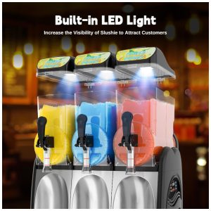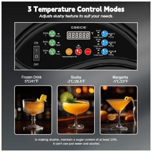 A Máquina de Margarita da GSEICE oferece alta eficiência e praticidade, com três tanques de 15 litros cada, ideais para preparar slushies em reuniões familiares ou servir margaritas refrescantes. Possui anel de vedação no tanque que evita vazamentos. Com controles intuitivos, é fácil de operar e versátil o suficiente para criar diferentes tipos de bebidas congeladas, como slushies, margaritas e coquetéis. Fácil de limpar, com bandeja removível e alerta de limpeza. Construção durável em aço inoxidável de alta qualidade e plástico resistente. Design moderno com LEDs embutidos nos tanques que destacam os produtos, tornando as bebidas mais atrativas e impulsionando as vendas. Aproveite para invejar a todos com drinks personalizados!