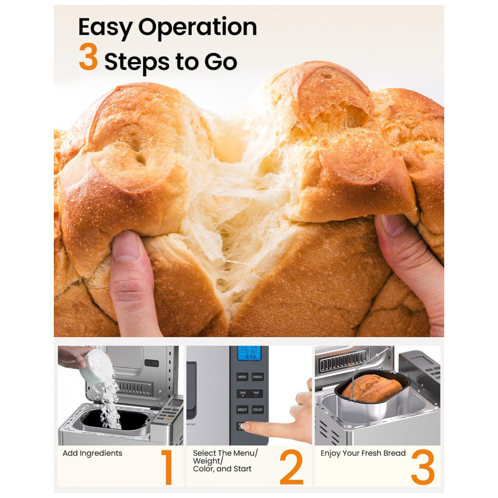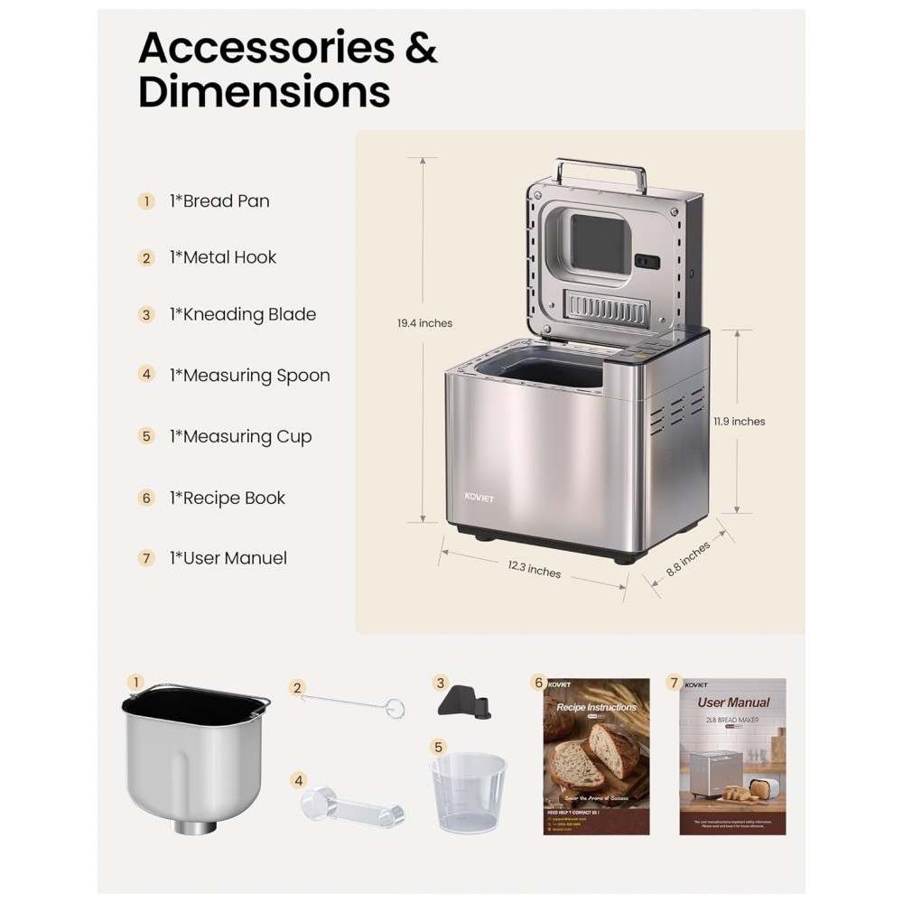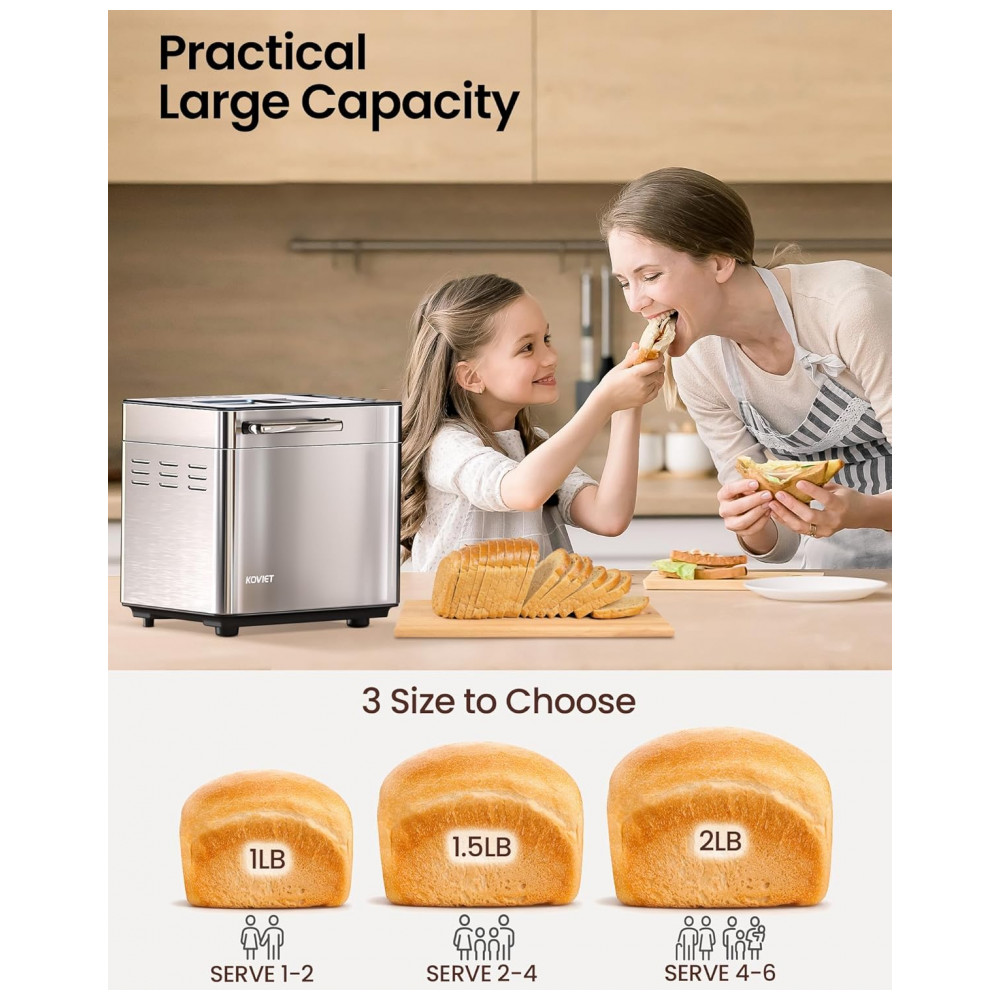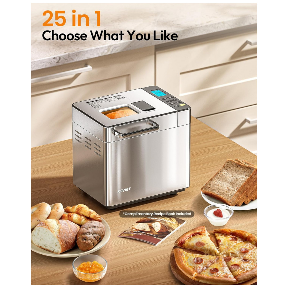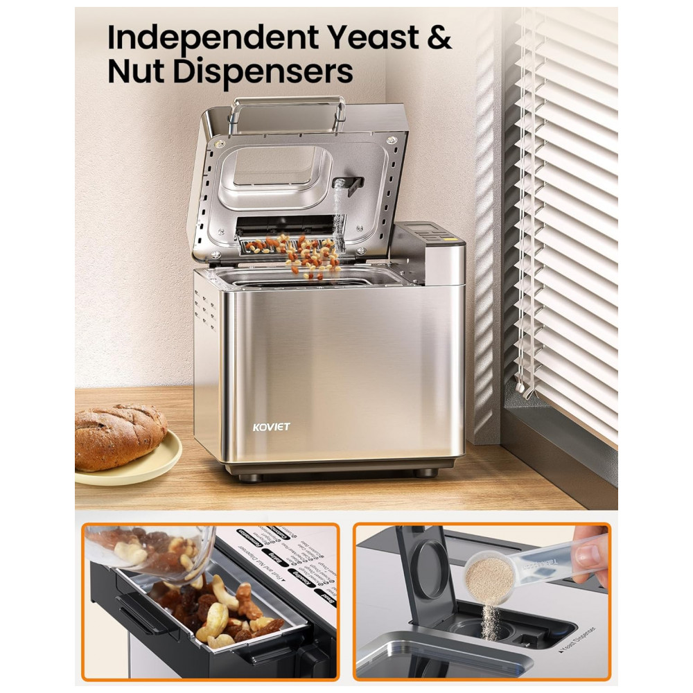 Máquina de Pão 25 em 1 KOVIET Aço Inoxidável Prata Dispensador Duplo Automático Gluten-Free Timer 15H Painel Touch