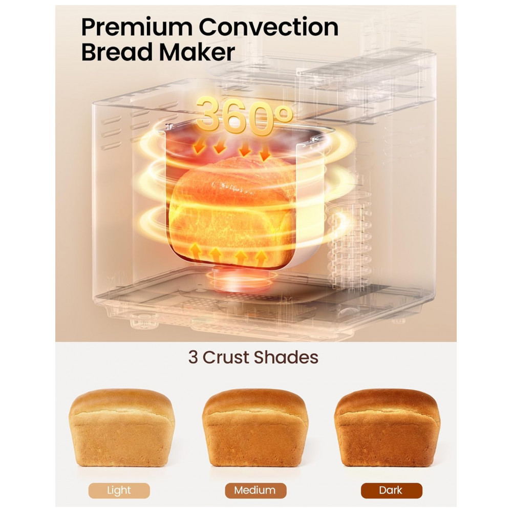 A Máquina de Pão KOVIET 25 em 1 apresenta 25 programas customizáveis, permitindo a preparação de pães integrais, sem glúten, bolos, geleias, iogurtes e massas diversas. Tem dispensadores duplos automáticos para liberação precisa dos ingredientes no momento ideal, com controle adaptativo de temperatura para garantir o sucesso do processo. Seu corpo em aço inoxidável reforçado e cuba antiaderente de alta condutividade térmica proporcionam durabilidade e cozimento uniforme, potencializando a reação de Maillard para crostas mais crocantes. A circulação de ar por convecção assegura aquecimento balanceado. O motor brushless de 650 W opera silenciosamente com alta performance e eficiência energética. Timer programável até 15 horas e função manter aquecido por 1 hora. Proteção contra falhas de energia por 10 minutos. Permite escolher entre três tamanhos de pão (454 g, 680 g e 907 g) e três níveis de crosta (clara, média e escura). O painel digital touch oferece operação intuitiva e moderna. Acompanha acessórios completos para uso e limpeza.