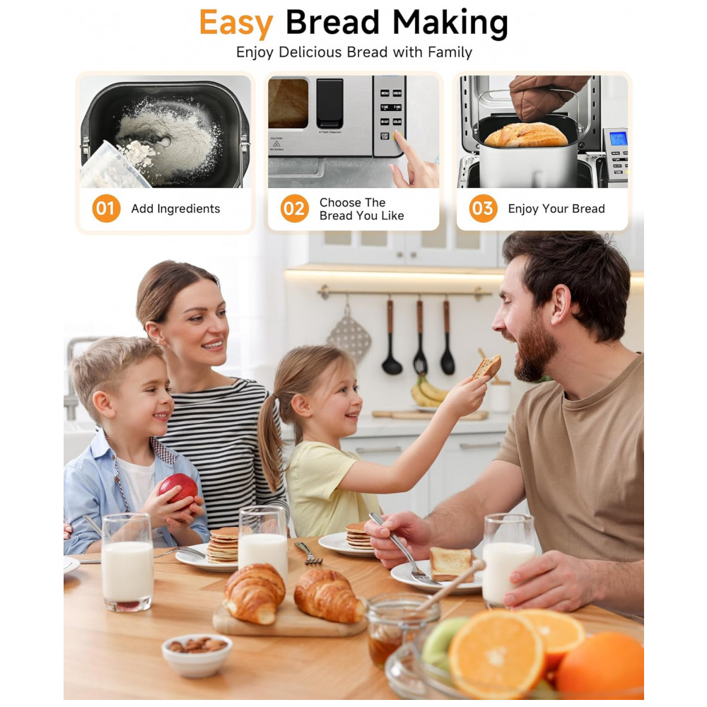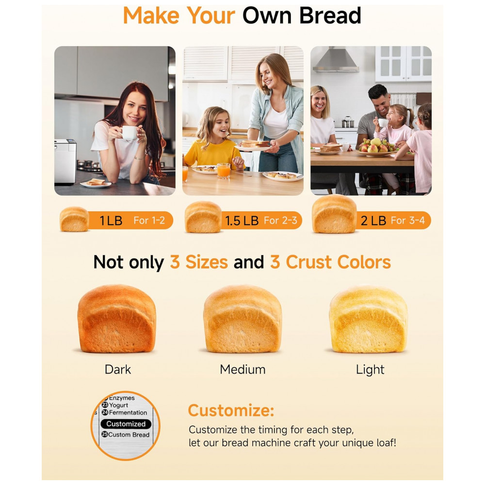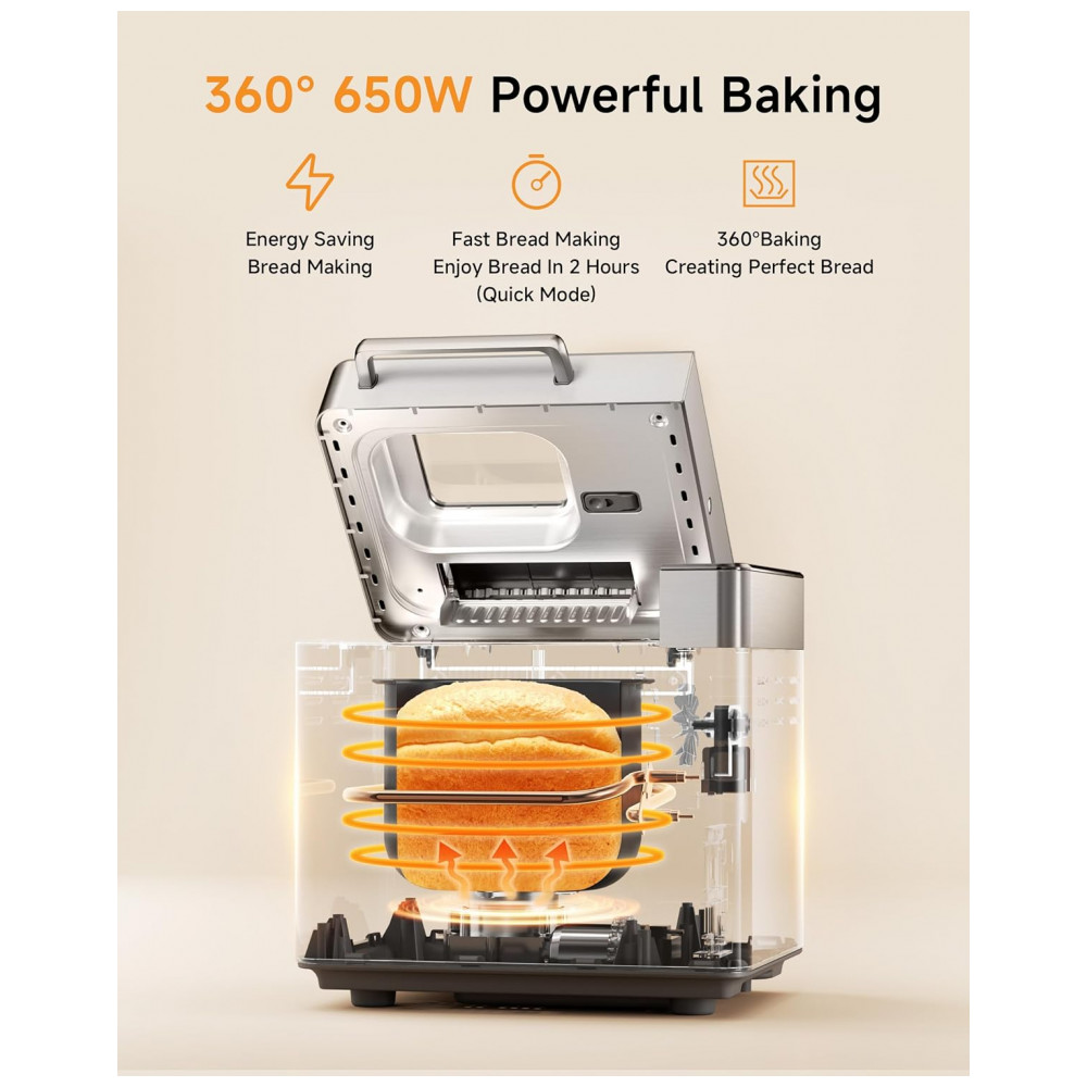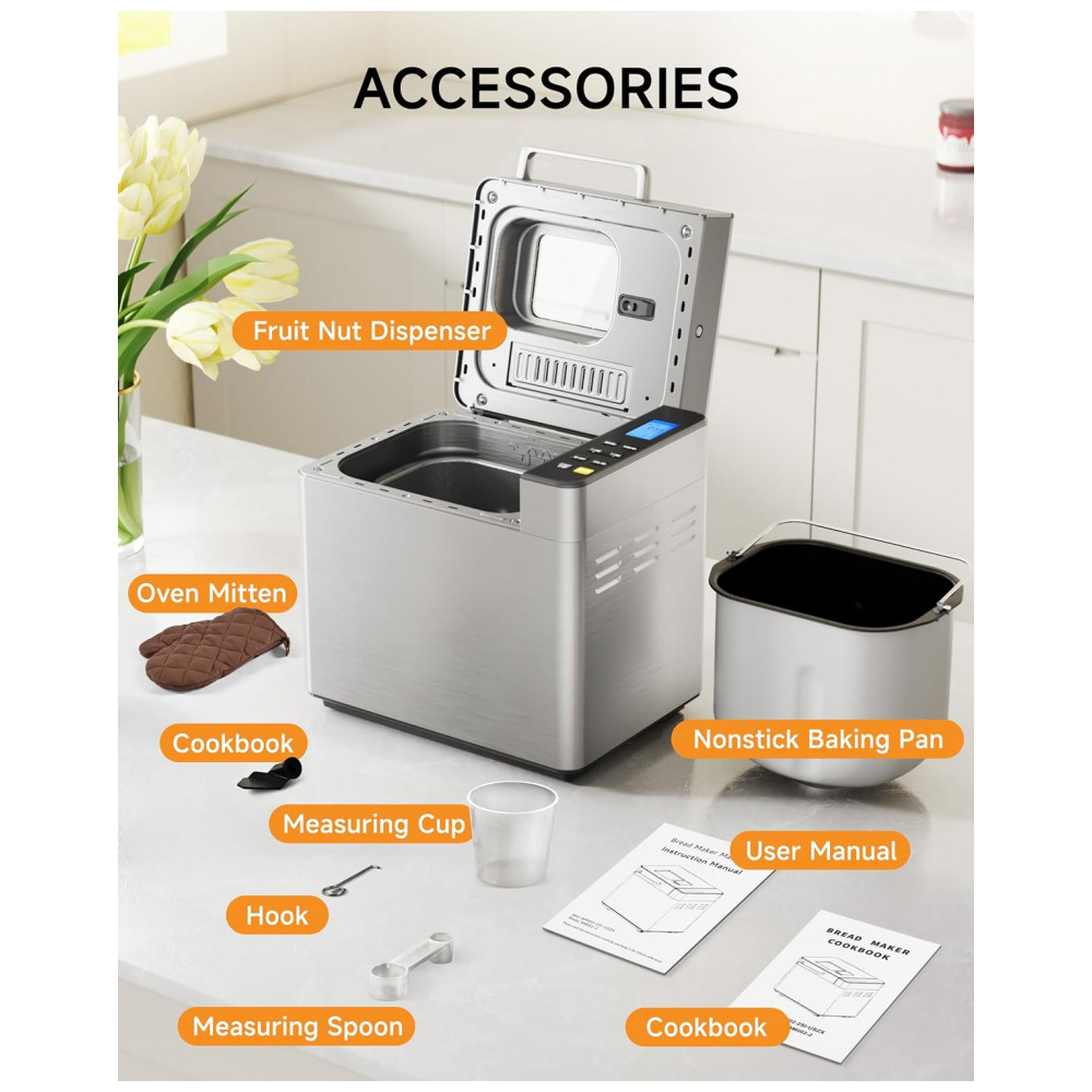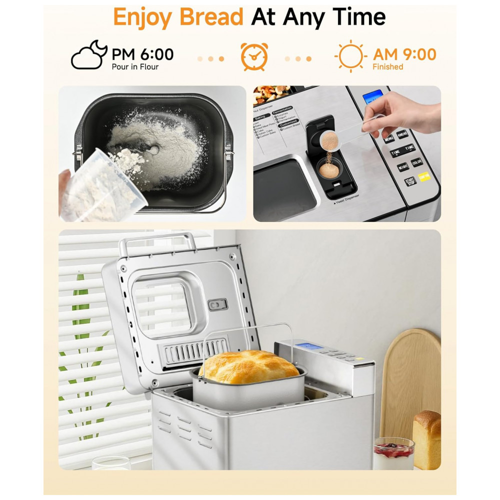 A Máquina de Pão Gleedelish 25 em 1 é projetada para iniciantes e entusiastas que desejam versatilidade na cozinha. Conta com 25 programas personalizáveis que abrangem pães integrais, sem glúten, bolos, geleias, iogurtes e mais. Apresenta dispensadores automáticos para lançamento de frutas e nozes, garantindo distribuição uniforme dos ingredientes no momento ideal. Equipamento oferece três opções de tamanho para pão (454 g, 680 g e 907 g) e três ajustes de cor da crosta (clara, média e escura). O display digital e painel touch facilitam a operação em poucos passos. Com potência de 650 W, sistema de aquecimento eficiente promove cocção rápida e uniforme por todo o pão, mantendo o interior macio e a crosta crocante. Timer programável de até 13 horas e função manter aquecido por 1 hora complementam a programação. A cuba cerâmica antiaderente e removível simplifica a limpeza. Acompanha luva térmica, copos e colheres medidoras, gancho para remoção da pá e manual.