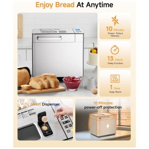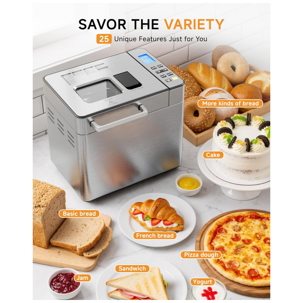 A Máquina de Pão Gleedelish 25 em 1 é projetada para iniciantes e entusiastas que desejam versatilidade na cozinha. Conta com 25 programas personalizáveis que abrangem pães integrais, sem glúten, bolos, geleias, iogurtes e mais. Apresenta dispensadores automáticos para lançamento de frutas e nozes, garantindo distribuição uniforme dos ingredientes no momento ideal. Equipamento oferece três opções de tamanho para pão (454 g, 680 g e 907 g) e três ajustes de cor da crosta (clara, média e escura). O display digital e painel touch facilitam a operação em poucos passos. Com potência de 650 W, sistema de aquecimento eficiente promove cocção rápida e uniforme por todo o pão, mantendo o interior macio e a crosta crocante. Timer programável de até 13 horas e função manter aquecido por 1 hora complementam a programação. A cuba cerâmica antiaderente e removível simplifica a limpeza. Acompanha luva térmica, copos e colheres medidoras, gancho para remoção da pá e manual.