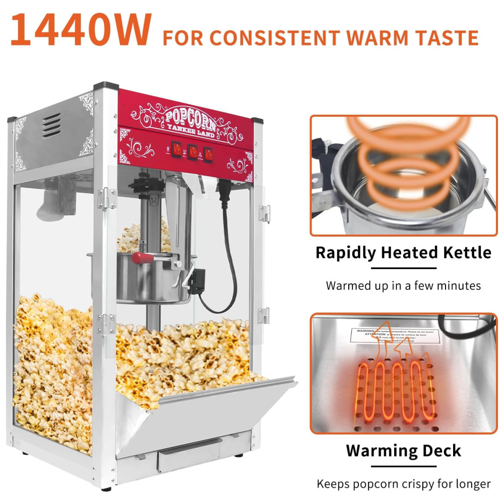 Máquina de Pipoca de Alta Eficiência: Esta máquina de pipoca de 454 g é ideal para uso doméstico ou comercial. Com 1440W de potência, estoura até 26,5 litros por lote, tornando-a perfeita para servir grandes grupos. Sua chaleira eficiente garante um fluxo constante de pipoca, ideal para noites de cinema e eventos.