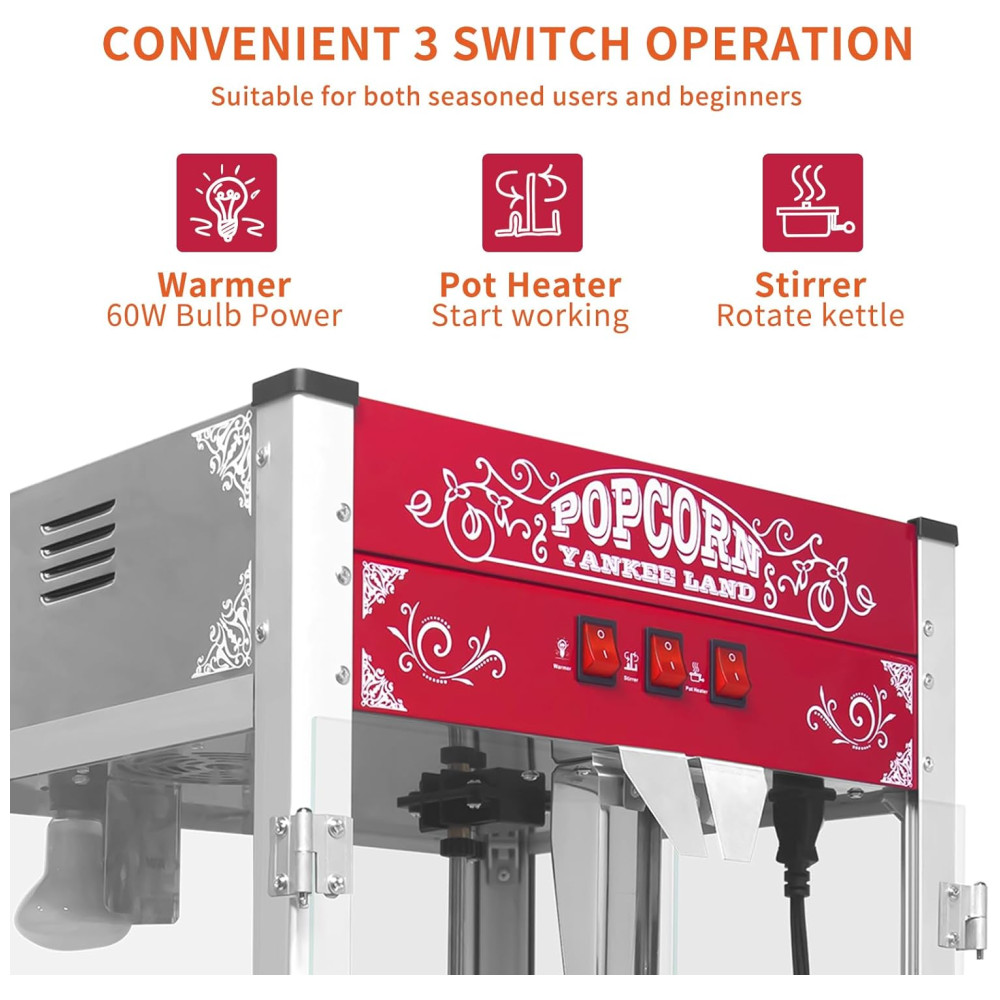 Máquina de Pipoca Fácil de Usar: Com três interruptores de controle para o aquecedor, misturador e aquecedor da panela, esta máquina de pipoca de mesa simplifica a operação. Os controles intuitivos, juntamente com uma luz LED interna, garantem uma preparação suave da pipoca e uma atmosfera profissional de cinema.