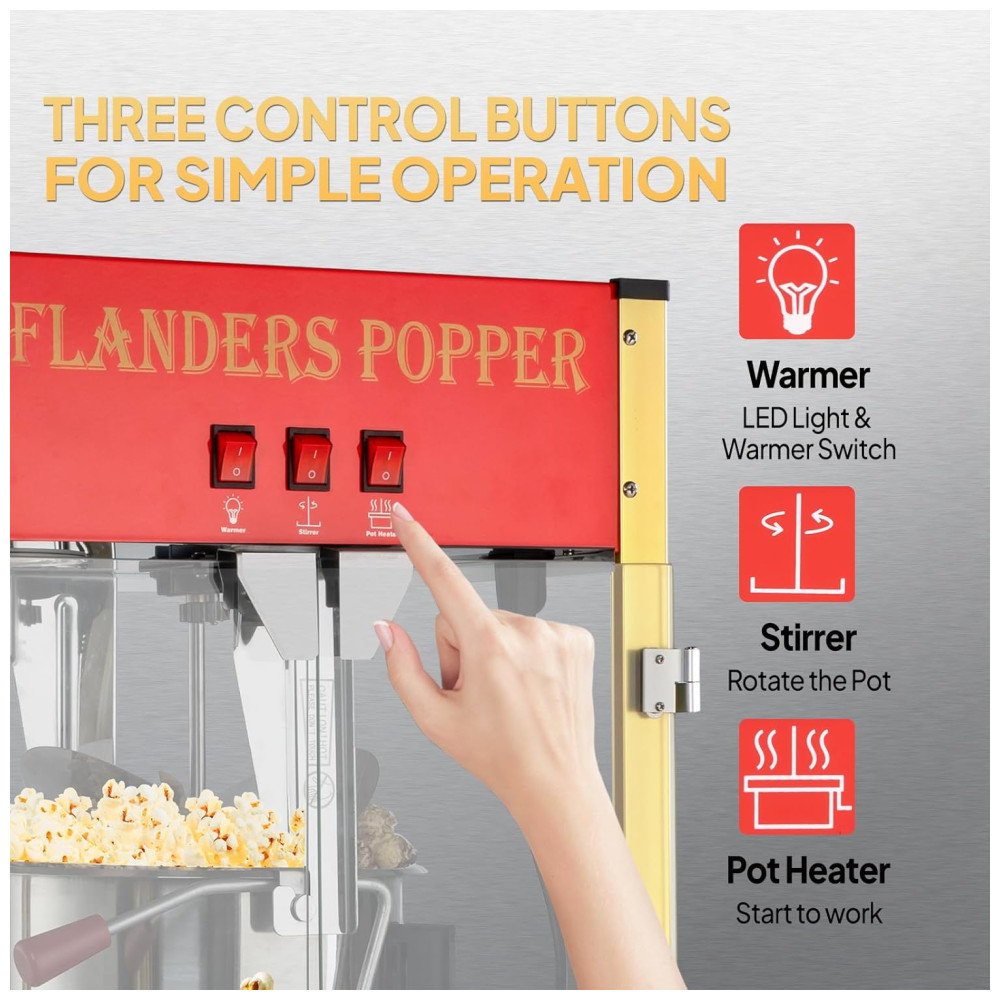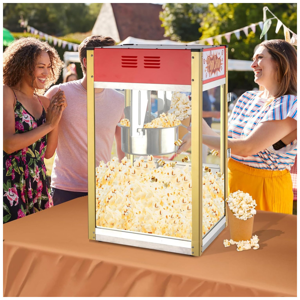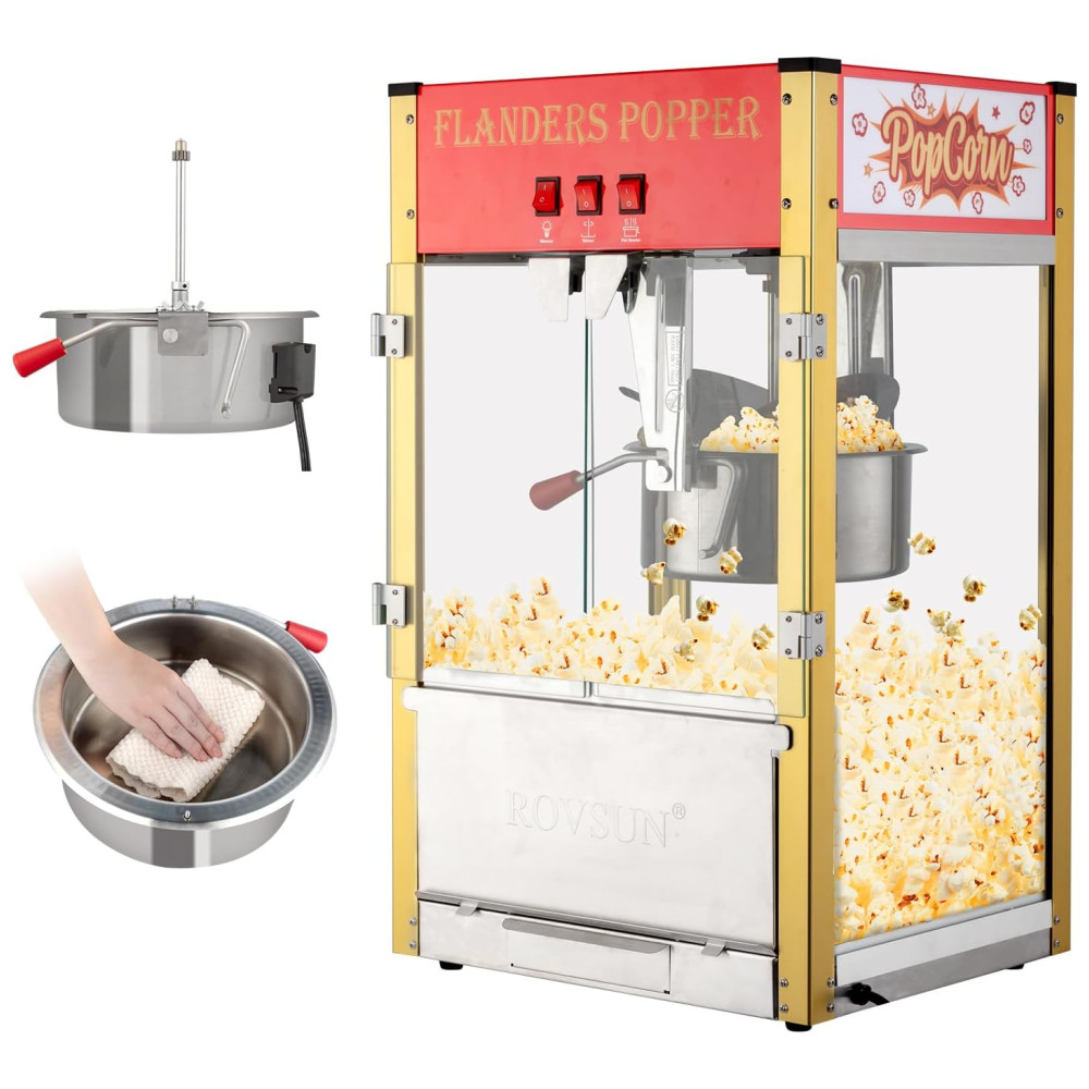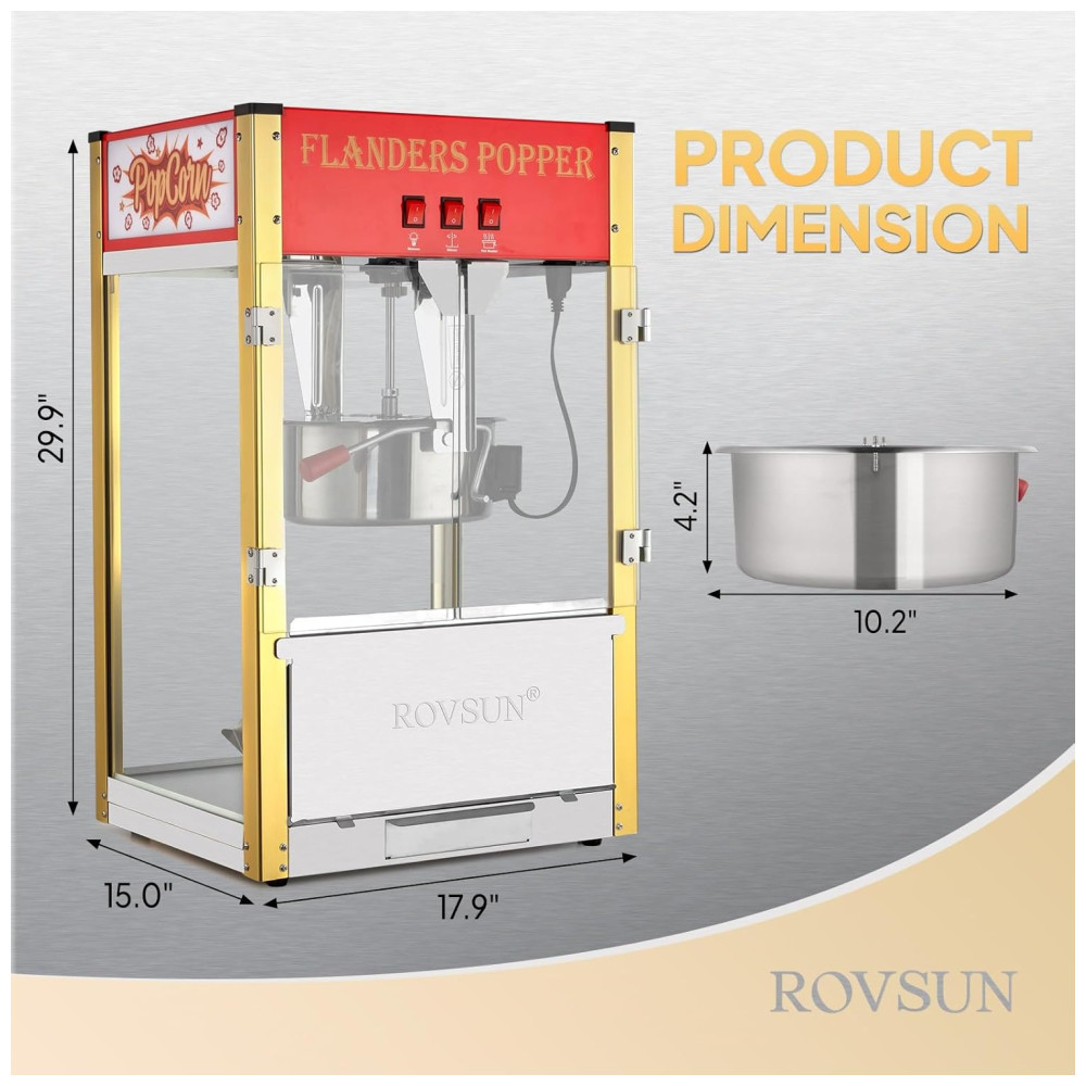 Máquina de Pipoca Comercial ROVSUN 12oz Aço Inox 1400W 80 Xícaras por Ciclo LED Interno Tampa Vidro Temperado Vermelha