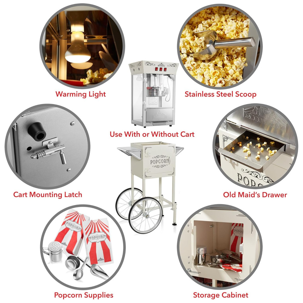 Máquina de Pipoca Estilo Cinema com Carrinho e Chaleira 028g Creme. Popper sobre rodas estilo vintage ideal para festas e eventos.