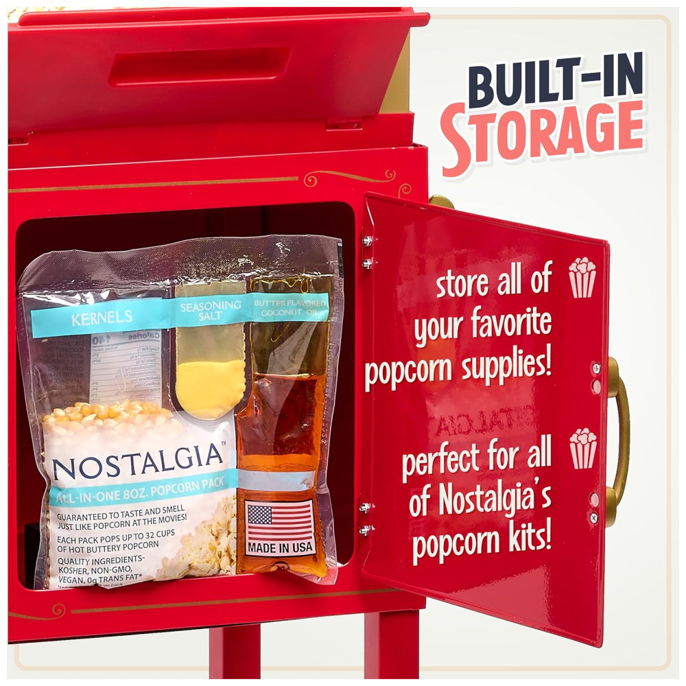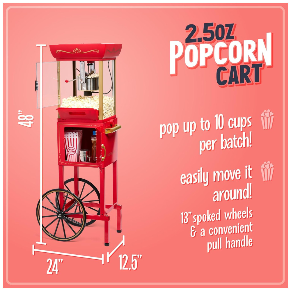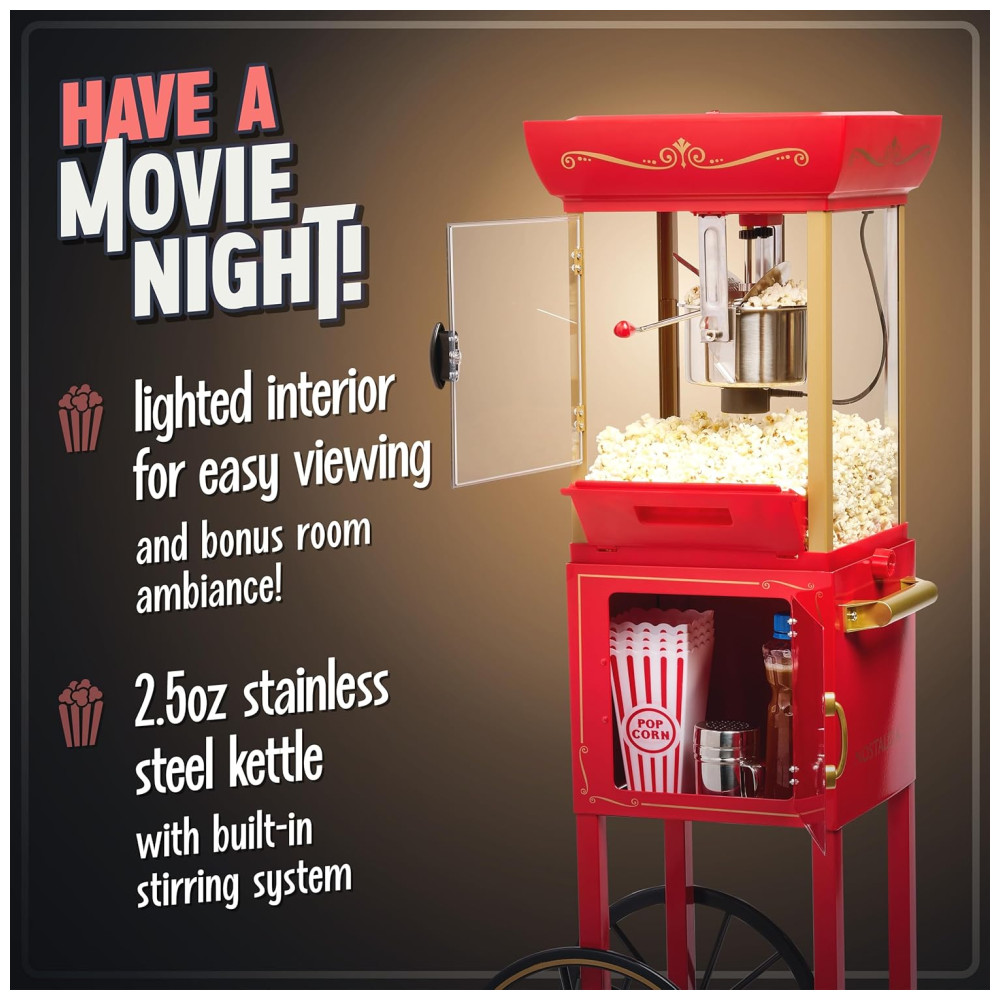 Máquina de Pipoca Nostalgia com Carrinho Panela de 70 g faz até 24 L de Pipoca. Estilo Vintage de Cinema Ideal para Sessões em Casa. Cor Vermelha.