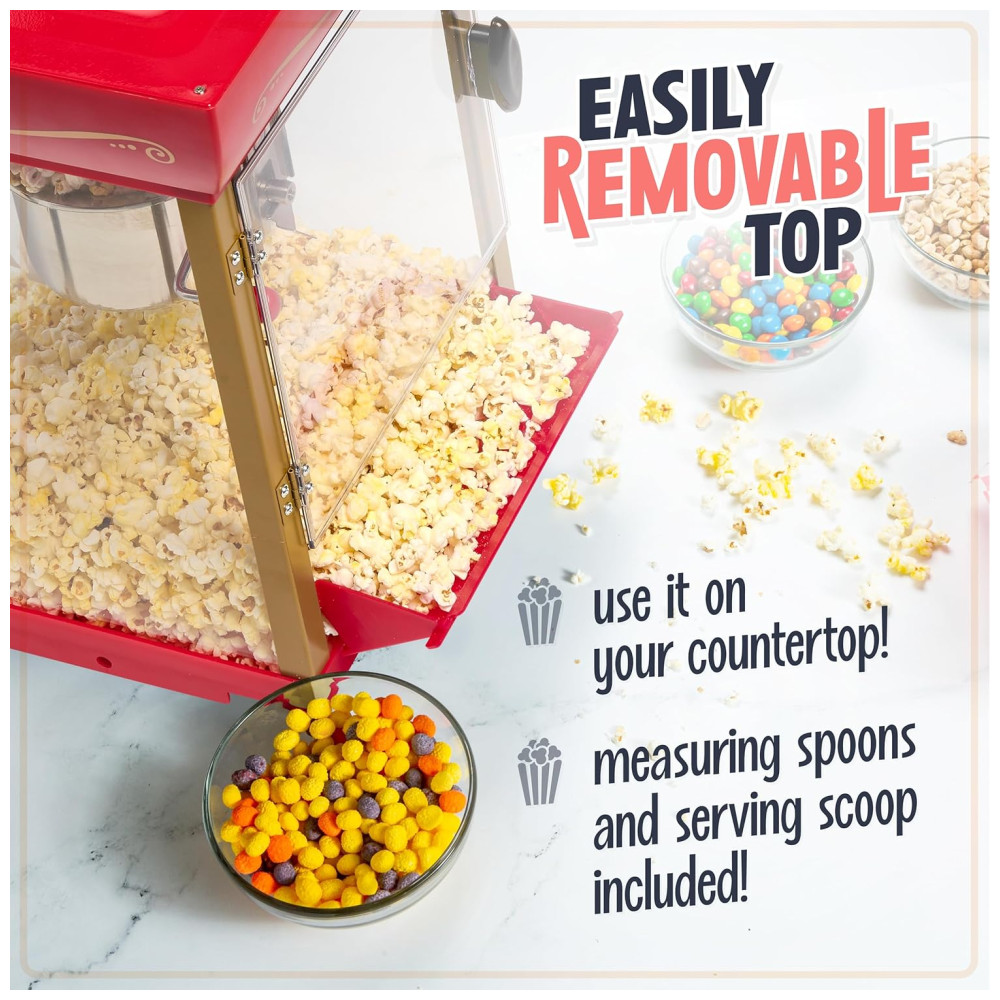 Esta máquina vintage faz até 2,4 L (10 xícaras) de pipoca por vez, garantindo pipocas frescas e abundantes para todos durante o filme ou lanche.