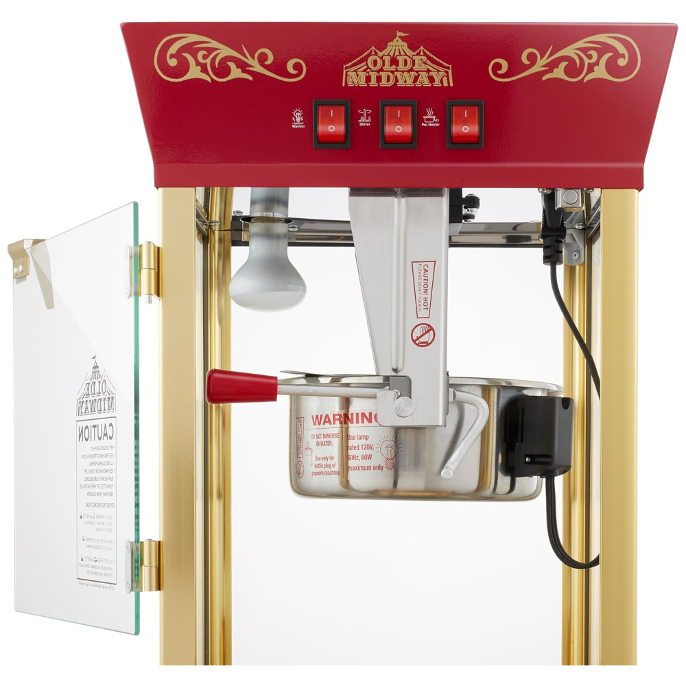 Com a máquina de pipoca Olde Midways com carrinho, você pode desfrutar de deliciosas pipocas gourmet estilo cinema em qualquer lugar. Com um design vintage que oferece charme nostálgico, esta máquina de pipoca de 850 watts é equipada com um motor potente e silencioso, além de recursos modernos para operação fácil e conveniente. A chaleira de 0,35 gramas pode produzir cerca de 15,16 litros de pipoca por lote, tornando a ideal para grandes multidões em cinemas domésticos, salas de descanso de escritórios, noites de jogos, carnavais escolares, jogos da liga infantil e muito mais. O carrinho de pipoca possui rodas estilo bicicleta para mobilidade e um armário de armazenamento com amplo espaço para suprimentos de pipoca. Construída com materiais altamente duráveis, incluindo zonas de alimentos em aço com revestimento em pó resistente e aço inoxidável, paredes de vidro de segurança temperado, pintura premium vibrante e um motor de qualidade comercial, esta máquina de pipoca é construída para durar. Limpa facilmente com água e funciona com um cabo de alimentação padrão dos EUA de 120 volts para configuração rápida e fácil em praticamente qualquer lugar. Inclui Máquina de Pipoca Olde Midway com Chaleira de 0,35 gramas Carrinho de Pipoca com Rodas Suprimentos em Aço Inox 12 xícaras Copo Medidor, Colher de Sopa, Colher de Pipoca e Saleiro 50 Sacos de Pipoca Dimensões 2012 L x 1712 P x 54 A Pequena montagem necessária. A máquina de pipoca pode ser usada com ou sem carrinho.