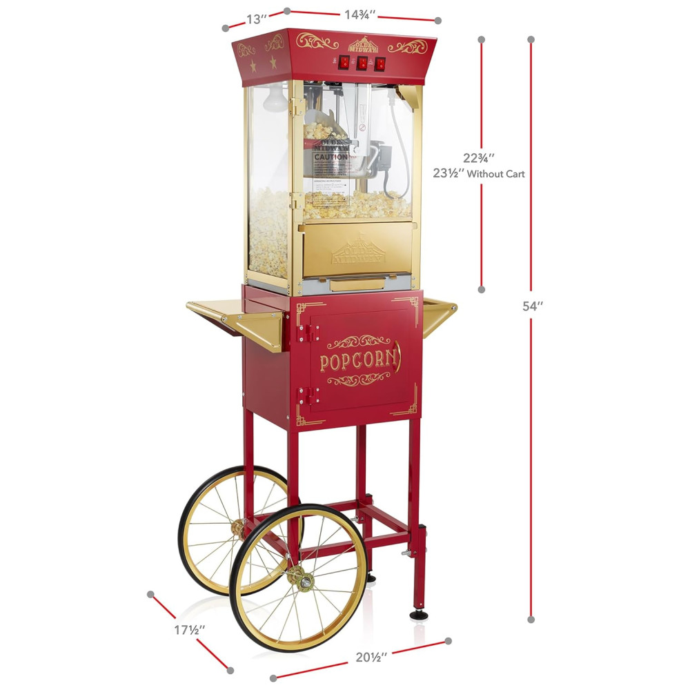 Máquina de Pipoca Popper sobre Rodas Estilo Vintage com Carrinho e Chaleira de 035g Vermelha. Ideal para Cinema em Casa e Eventos.